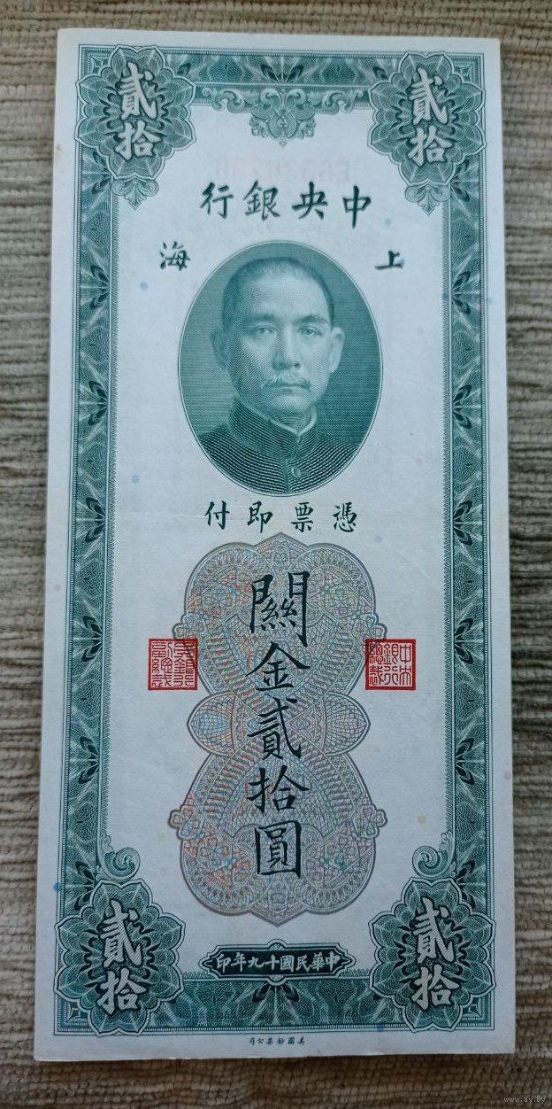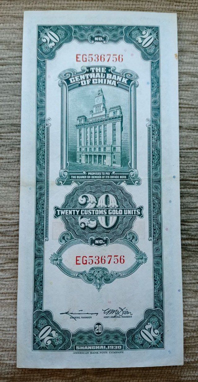 Werty71 КИТАЙ 20 золотых таможенных единиц 1930 Банкнота юаней Большой формат