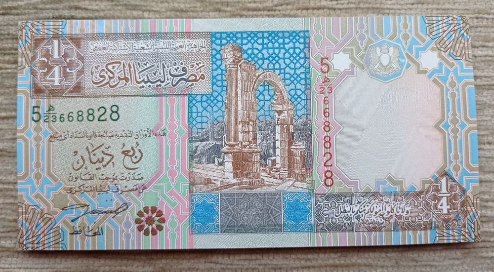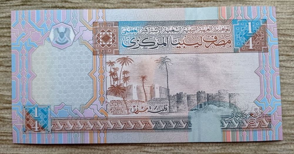 Werty71 Ливия 1/4 динара 2002 UNC Арка Траяна Лептис Магна Крепость Марзук банкнота