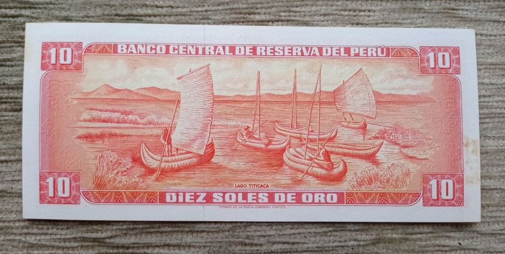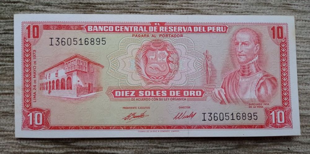 Werty71 Перу 10 солей золотом 1973 аUNC банкнота Пятно Гарсиласо Инка де ла Вега Дом Веги в Куско Озеро Титикака