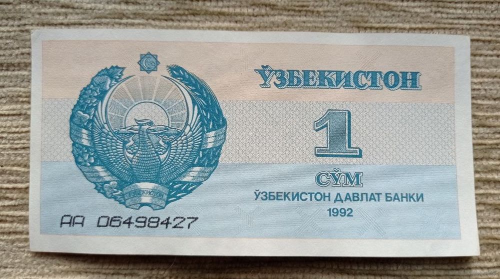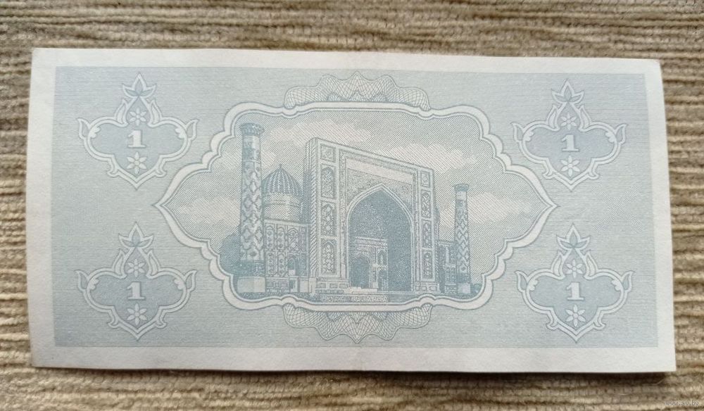 Werty71 Узбекистан 1 сом сум 1992 банкнота Герб Медресе Шердор с площади Регистан