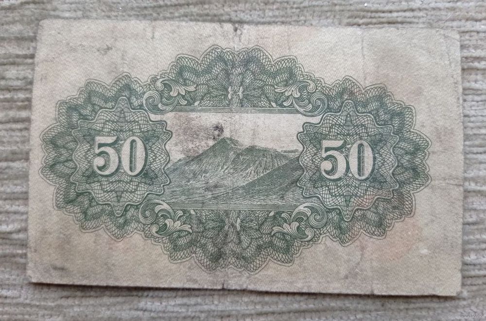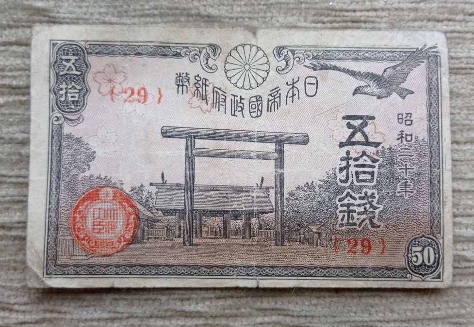 Werty71 Япония 50 сен 1945 Синтоистское святилище Ясукуни в Токио цветки сакуры Банкнота коршун чёрный Асахи - Таке - вулкан