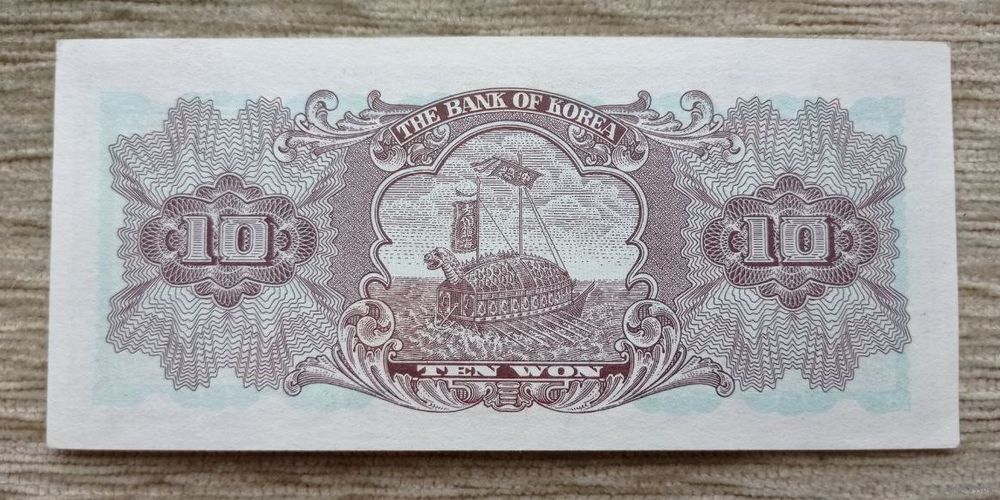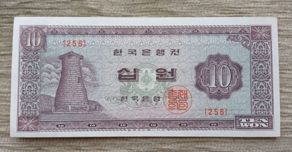 Werty71 Южная Корея 10 хван вон 1962 1965 аUNC банкнота Обсерватория Чхомсондэ Кёнджу VII век Корабль черепаха