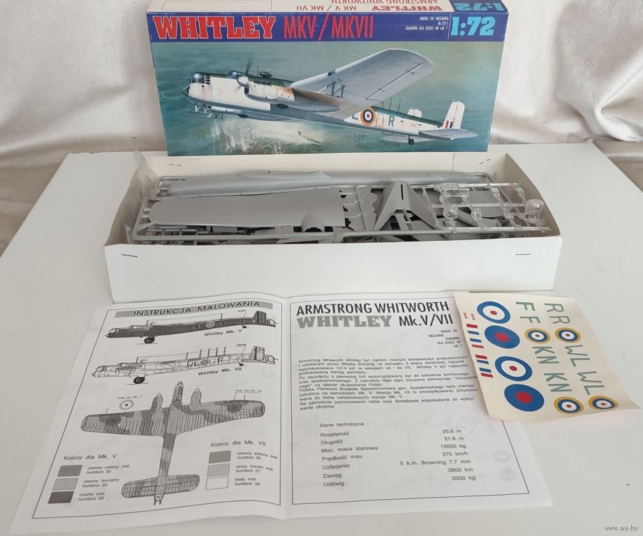 "Whitley MkV/MkVII", сборная модель бомбардировщика в масштабе 1/72 . Модель “Whitley” редко встречается на модельном рынке, поэтому тем интереснее будет рассматривать британскую разработку FROG, впервые представленную в 1970-м году. После завершения производства в Великобритании пресс-форма была продана Советскому Союзу и отправилась в Минск, где эта модель с 1980-го года стала выпускаться под названием “Самолёт Бомбардировщик”. После ликвидации фирмы “Корпак” в 1997-м году и продажи производственной оснастки для “экс-фроговских” моделей в Россию, её следы теряются. Данный вариант модели выпускался в упаковке для польского рынка.