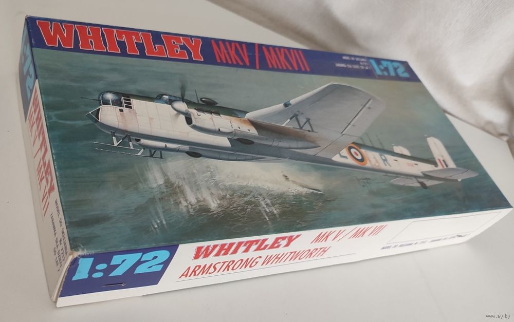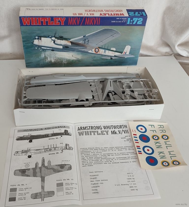 "Whitley MkV/MkVII", сборная модель бомбардировщика в масштабе 1/72 . Модель “Whitley” редко встречается на модельном рынке, поэтому тем интереснее будет рассматривать британскую разработку FROG, впервые представленную в 1970-м году. После завершения производства в Великобритании пресс-форма была продана Советскому Союзу и отправилась в Минск, где эта модель с 1980-го года стала выпускаться под названием “Самолёт Бомбардировщик”. После ликвидации фирмы “Корпак” в 1997-м году и продажи производственной оснастки для “экс-фроговских” моделей в Россию, её следы теряются. Данный вариант модели выпускался в упаковке для польского рынка.