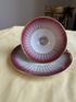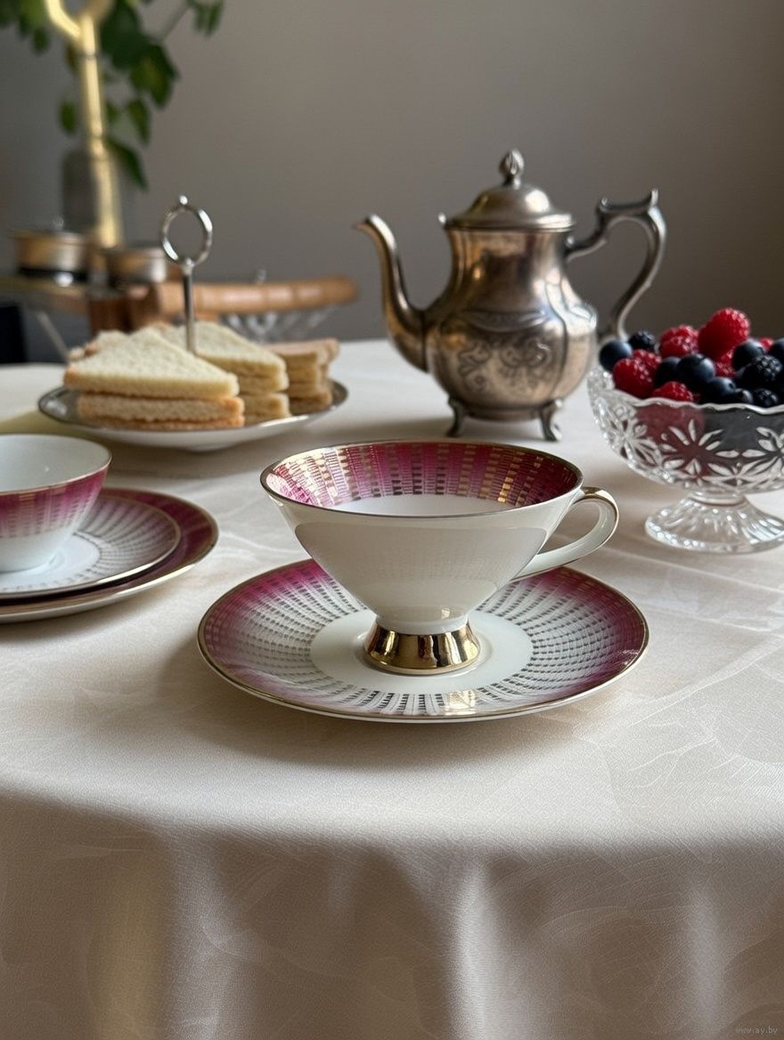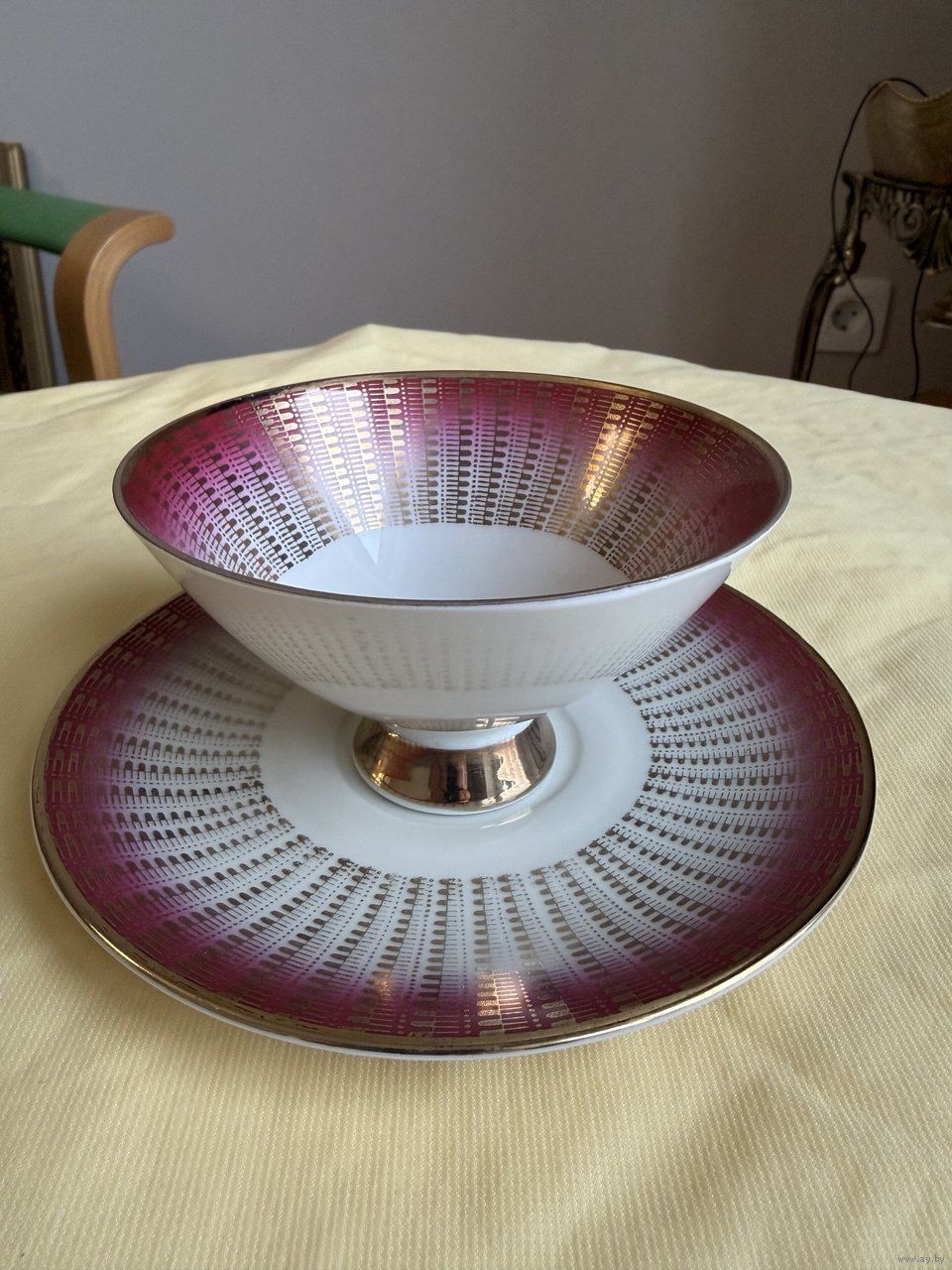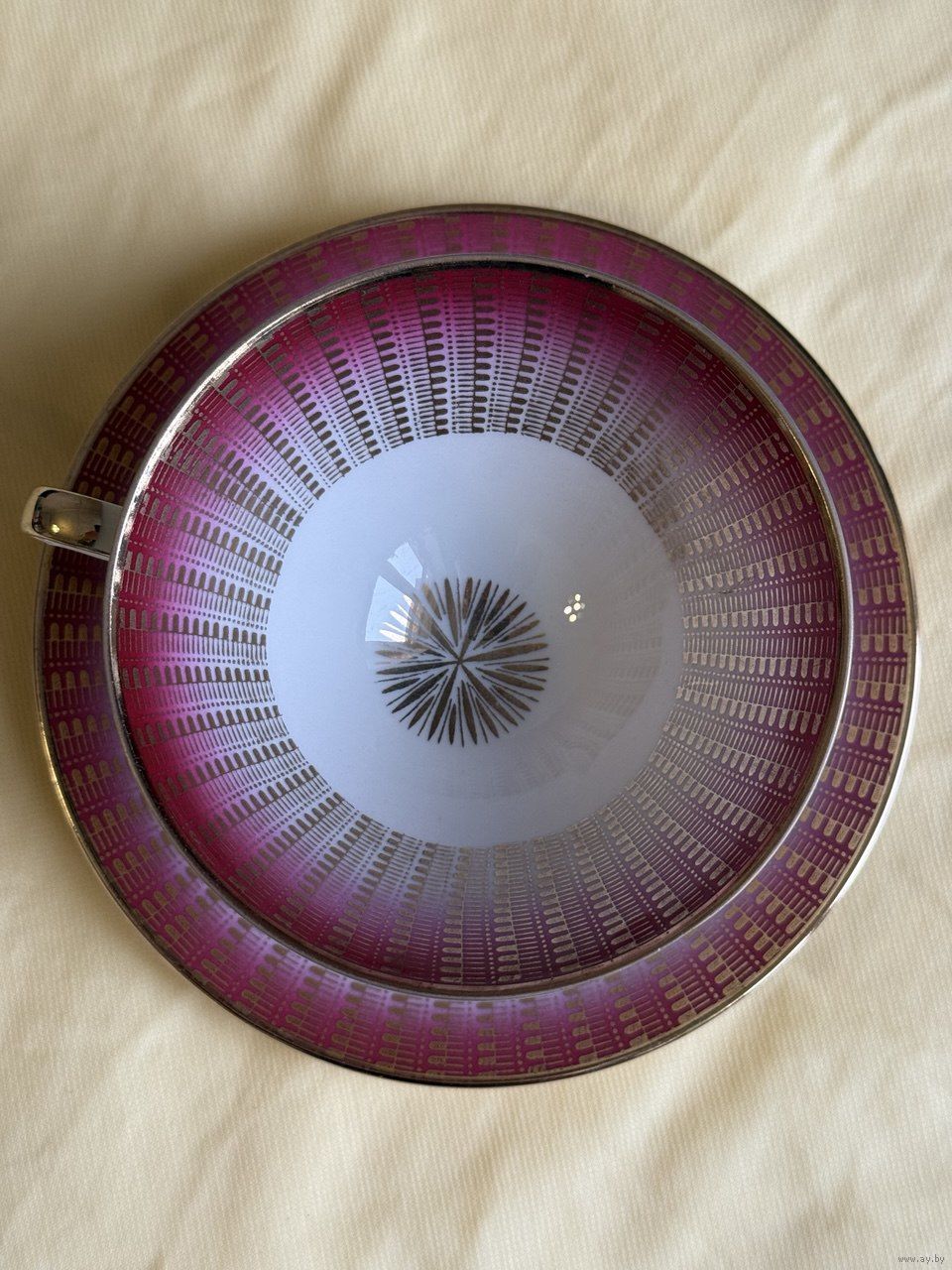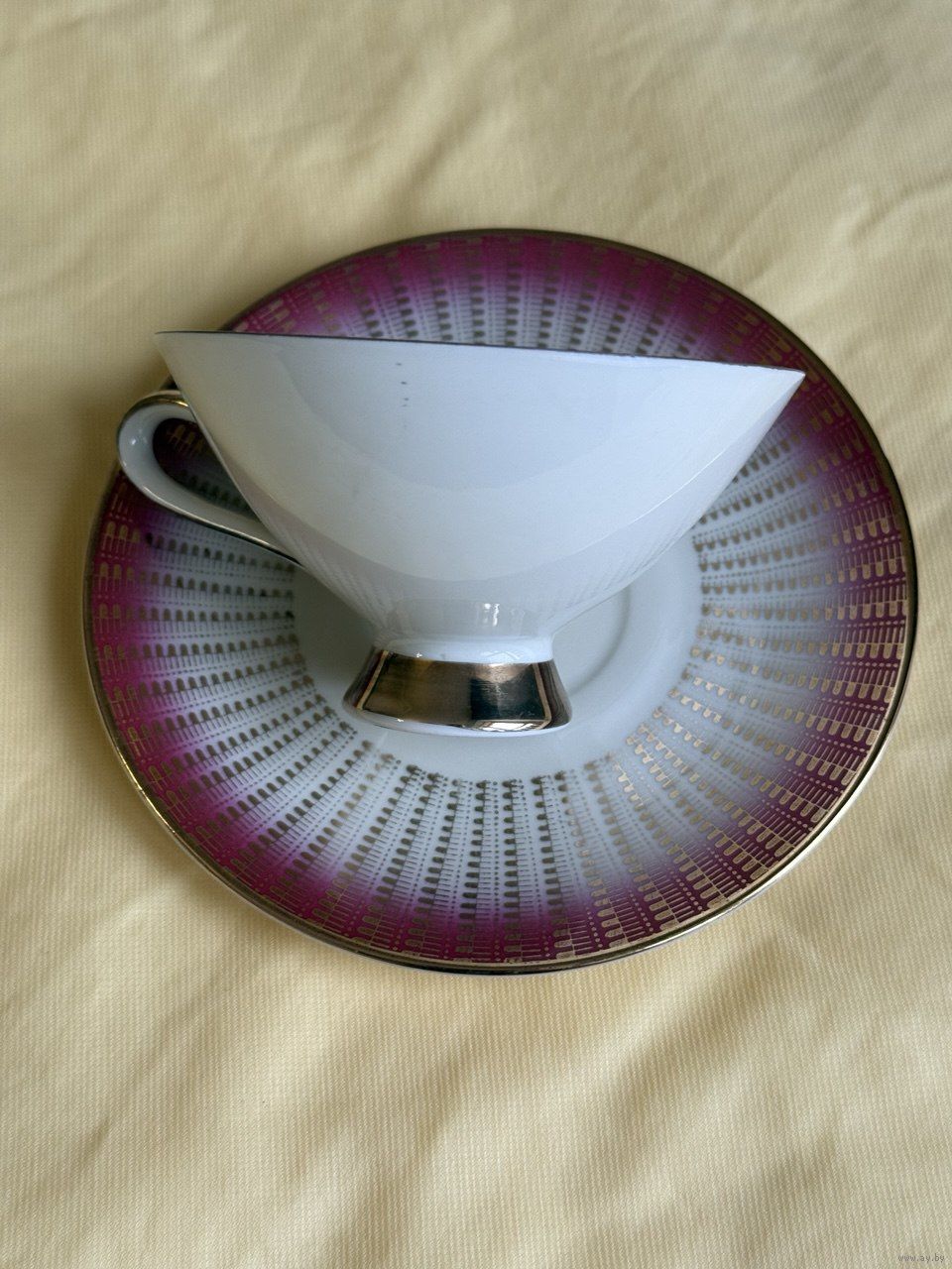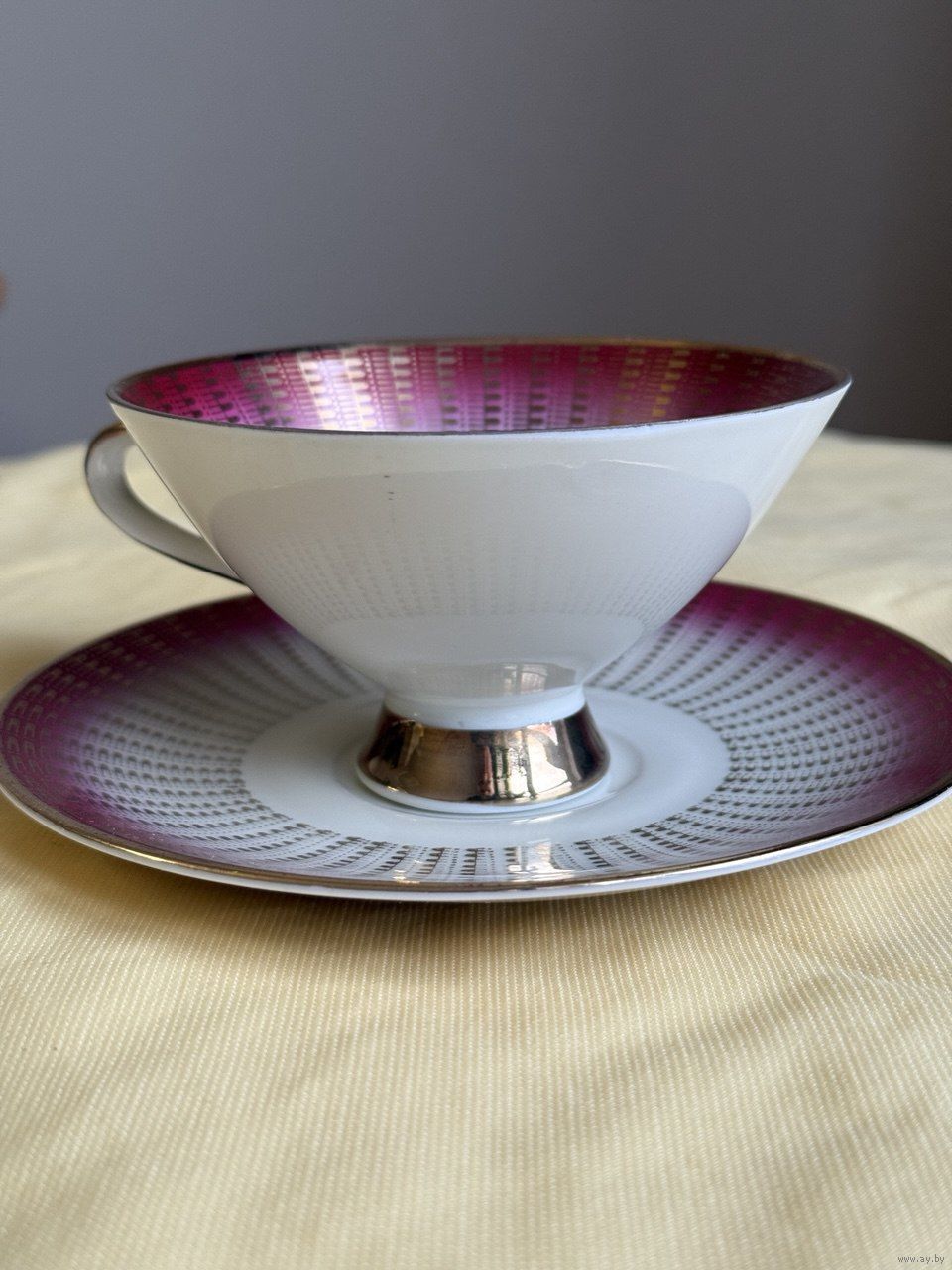 Эффектная винтажная чайная пара в малиново-розовом цвете, много окантовки в золоте.Геометрический орнамент. Может быть достойным экземпляром коллекции или украшением сервировки .