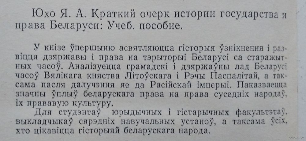Я. А. Юхо. Кароткі нарыс гісторыі дзяржавы і права Беларусі. Мінск: Універсітэцкае. 1992 г. 269 с. Цверды пераплет.
