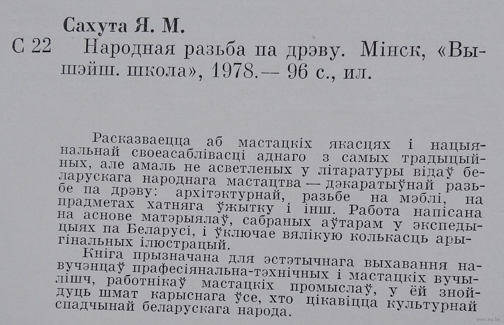 Я. М. Сахута. Народная разьба па дрэву. Мінск : Вышэйшая школа, 1978 г. 92 c. Цверды пераплет.