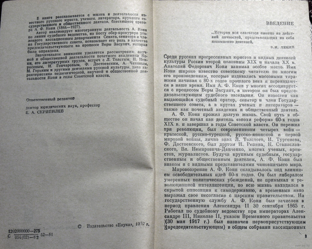 В книге рассказывается о жизни и деятельности известного русского юриста, ученого, литераторгосударственного и общественного деятеля, блестящего оратора А. Ф. Кони (1844-1927). Автор анализирует многогранную деятельность А. Кони по линии судебного ведомства, на посту обер-прокурора уголовного кассационного департамента Сената, сенатора и члена Государственного совета, показывает его роль в качестве председательствующего на процессе Веры Засулич, которая была оправдана. Значительное внимание уделяется рассмотрению научной и общественной деятельности почетного академика Кони, его литературных трудов, встреч с Л. Толстым, Н. Некрасовым, И. Гончаровым, Ф. Достоевским, А. Чеховым, М. Горьким и другими деятелями русской культуры, дана характеристика педагогической, научной и общественной деятельности Кони в годы Советской власти.