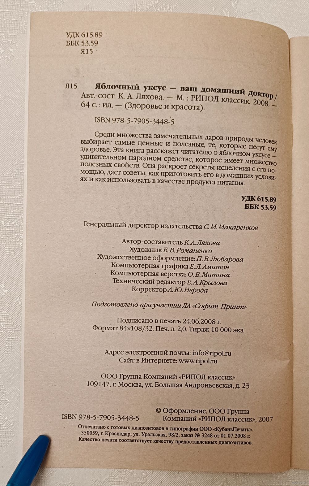 Яблочный уксус - ваш домашний доктор. Авт.-сост. К. А. Ляхова. М.: РИПОЛ классик, 2008. 64 с.: ил. - (Здоровье и красота), мягкая обложка.
