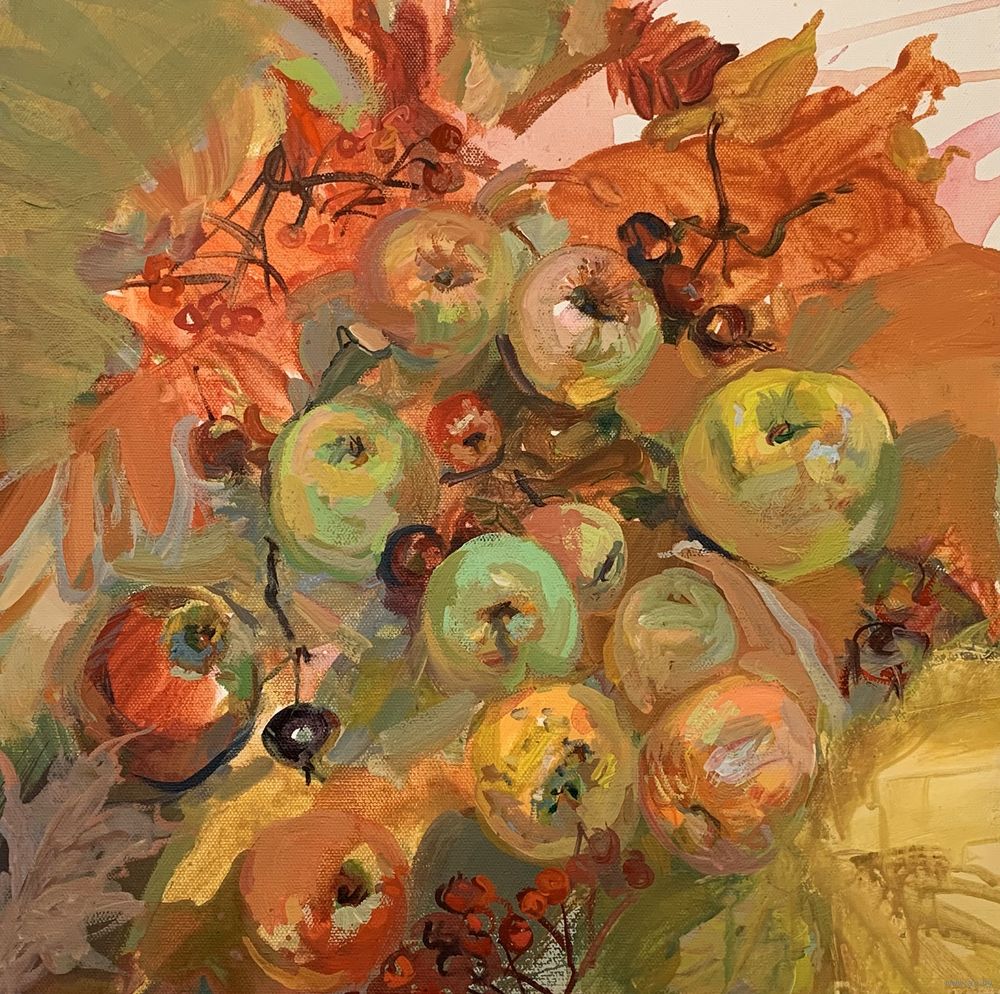 работа выполнена на холсте акрилом, размер 40*40см, на подрамнике, без рамы, осенний натюрморт яблоки и осенние листья, сезон урожая