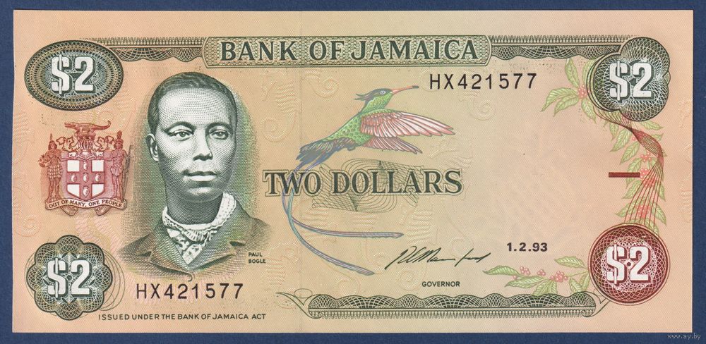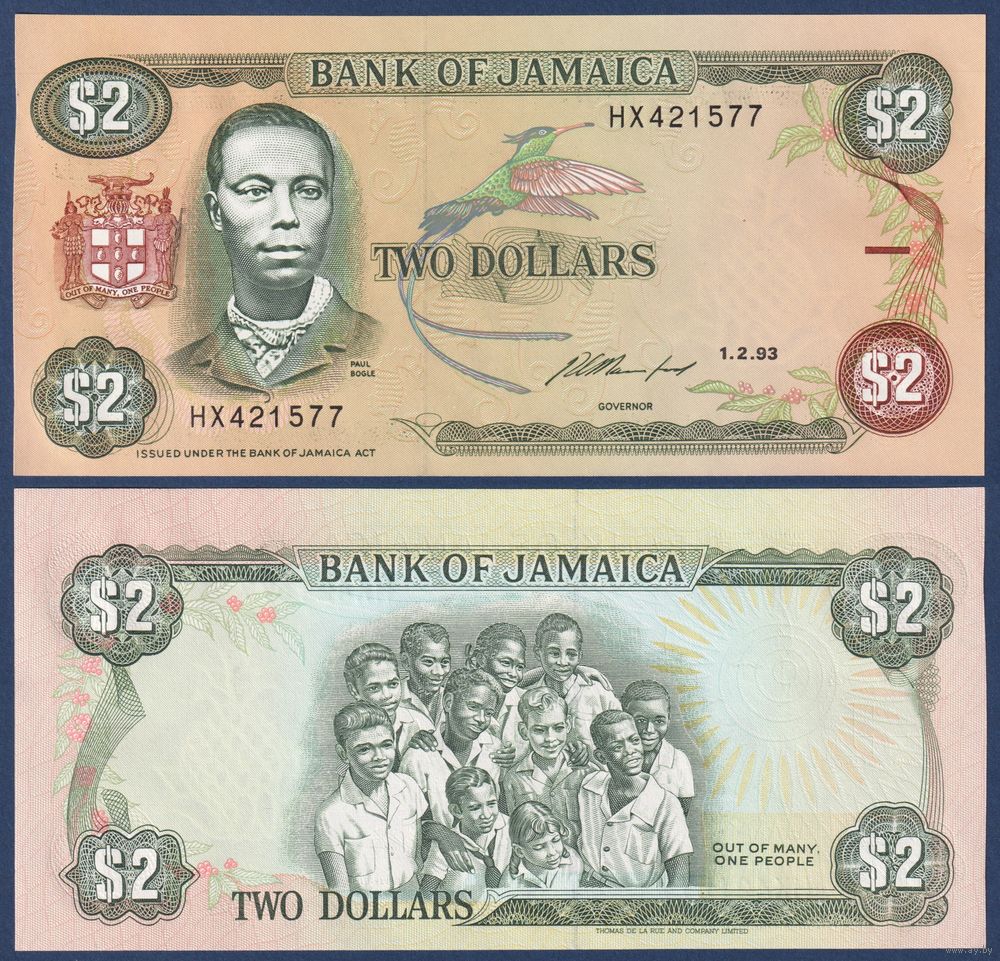 Ямайка, 2 доллара 1993 г., P-69e (HX, священник Пол Богл, ученики в школе Кингстона), UNC