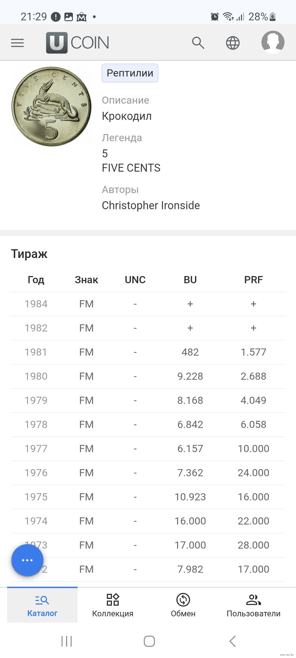 Ямайка 5 центов 1974 г ( Американский крокодил , малый тираж 22 тыс)