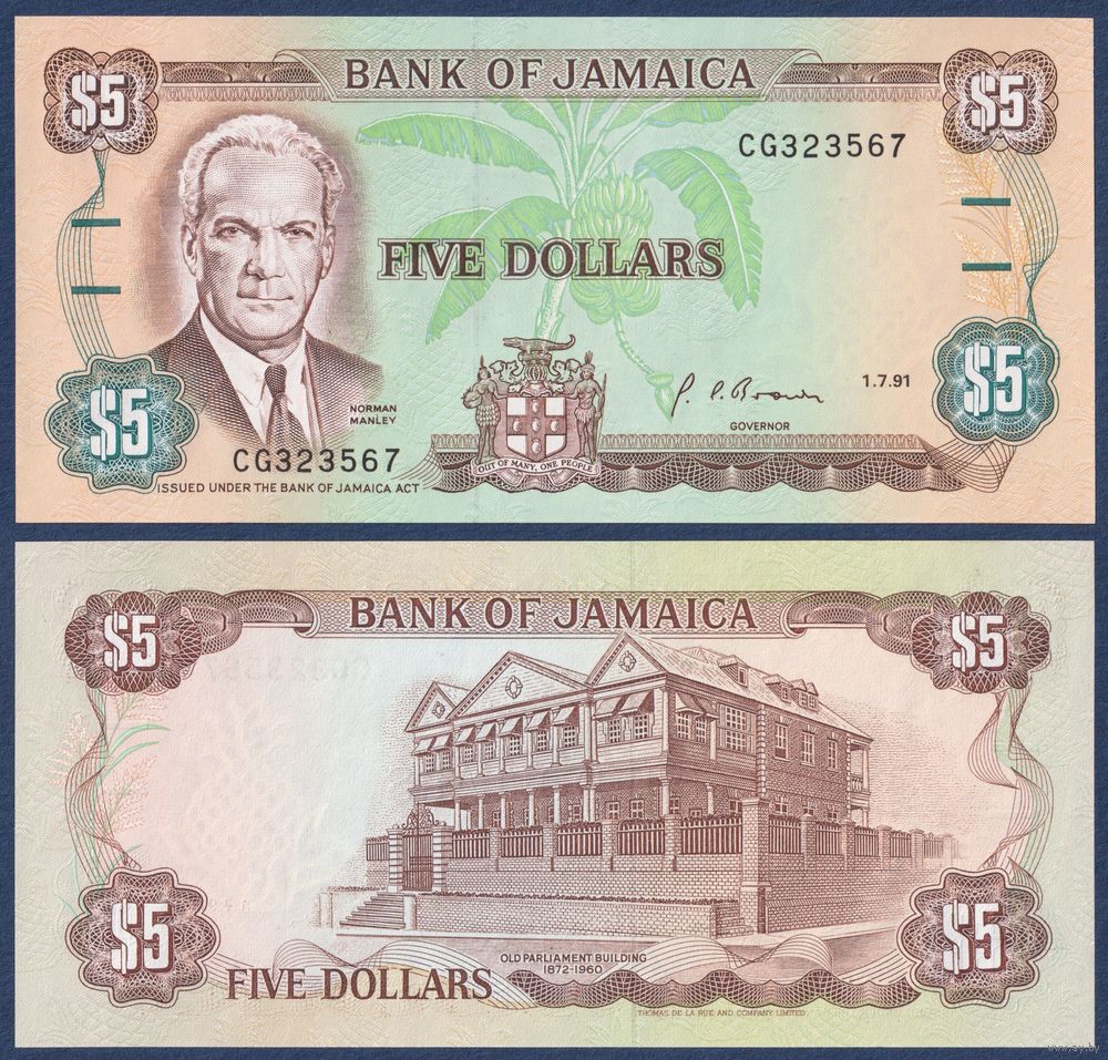 Ямайка, 5 долларов 1991 г, P-70d (CG, политик Норман Мэнгли), UNC