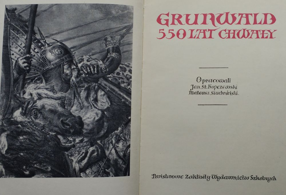 Юбилейное издание. Большой энциклопедический формат. Мелованный альбом. Ляссе. Тираж 20240 экз. 392 стр. Предыстория и ход знаменитой Грюнвальдской битвы на пол. яз. Иллюстрации. KOPCZEWSKI Jan, SIUCHNIŃSKI Mateusz "GRUNWALD 550 LAT CHWAŁY". Opracowali Jan St. Kopczewski, Mateusz Siuchniński; przedmowa Jan Zygmunt Jakubowski.