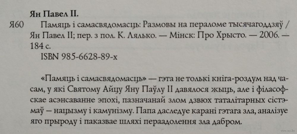 Ян Павел II. Памяць і самасвядомасць: размовы на пераломе тысячагоддзяў. Мінск : Про Хрысто, 2006 г. 183 с. Цверды пераплет.