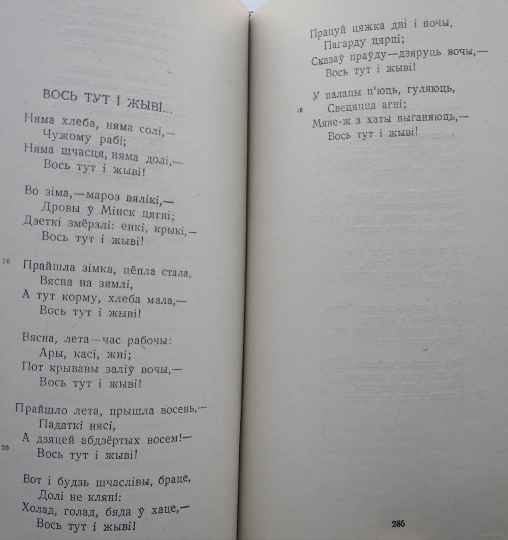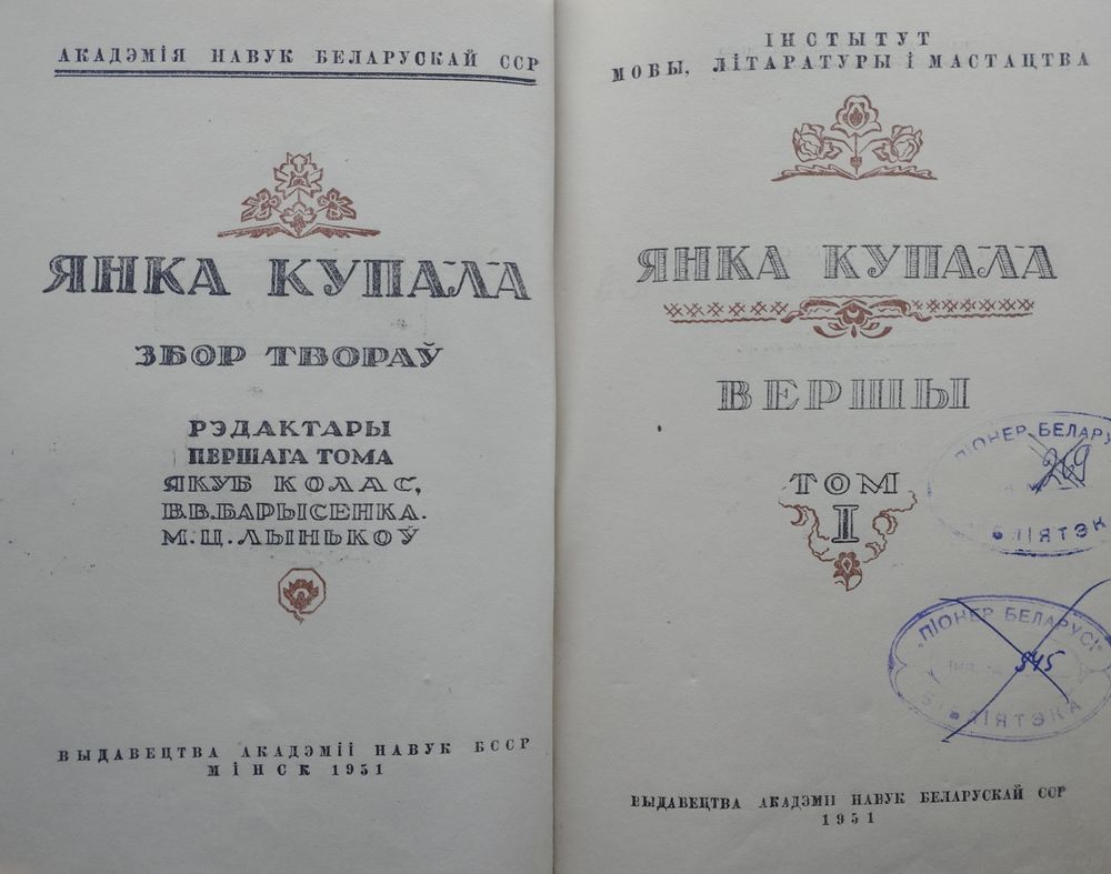 Вялікі фармат. 492 стар. Ляціць, гучыць Купалаў голас! Творчасць Янкі Купалы (1882 - 1942) называюць летапісам жыцця, працы і барацьбы беларускага народа, квітнеючым садам, у якім сабраны самыя дарагія каштоўнасці мастацкага слова. Купала адкрыў вобраз беларускага селяніна як першаасновы народнага жыцця, маралі, духоўнай моцы народа. Янка Купала, сапр. Іван Дамінікавіч нарадзіўся 7 ліпеня 1882 года (па новым стылі) у фальварку Вязынка Вілейскага павета ў сям’і арандатара Дамініка Ануфрыевіча Луцэвіча і яго жонкі Бянігны Валасевіч, якія належалі да саслоўя мяшчан (прыпісаны да мяшчан Мінска) і былі каталікамі. Скончыў Бяларуцкае народнае вучылішча (1898). Пасля смерці бацькі (1902) працаваў на гаспадарцы, потым хатнім настаўнікам, пісарам у судовага следчага ў Радашковічах (1903), малодшым прыказчыкам у маентку Беліца. Пісаць пачаў на польскай мове. Першы вядомы беларускі верш «Мая доля» датаваны 1904 г. Першы надрукаваны верш на беларускай мове - «Мужык» (15 траўня 1905 г. у менскай газеце «Северо-Западный край»). У 1908 г. пецярбургскае выдавецтва «Загляне сонца і ў наша ваконца» выпусціла першы зборнік паэта «Жалейка» (факсімільнае выданне ў 1982), у 1913 г. - зборнік «Шляхам жыцця». Зборнік вершаў «Гусляр» (1910) выдадзены ў Пецярбургу А.Грыневічам. У савецкі час выйшлі кнігі паэзіі «Спадчына» (1922), «Безназоўнае» (1925), «Апавяданні вершам» (у 2 кнігах, 1926), паэмы «Магіла льва» (1927), «Над ракою Арэсай» (1933), «Курган» (1987), зборнікі «Адцвітанне» (1930), «Песня будаўніцтву» (1936), «Беларусі ардэнаноснай» (1937), «Ад сэрца» (1940), «Беларускім партызанам» (вершы і артыкулы, Масква, 1942), кнігі выбраных вершаў, паэм (1930, 1935, 1936, 1946, 1947, 1948, 1952, 1958, 1967, 1970, 1972 - малафарматнае выданне, 1978, 1980, 1981, 1982 (4 выданні), 1987, 1988 (3 выданні), 1989 (2 выданні) і Зборы твораў у 6-ці (1925-1932), 3-х (1928-1932), 6-ці (1951-1954, 1961-1963), 7-мі (1972-1976) тамах. Многія вершы пакладзены на музыку. Для дзяцей неаднаразова выдаваліся вершы «Хлопчык і лётчык», «Алеся» і інш. Есць штампы.