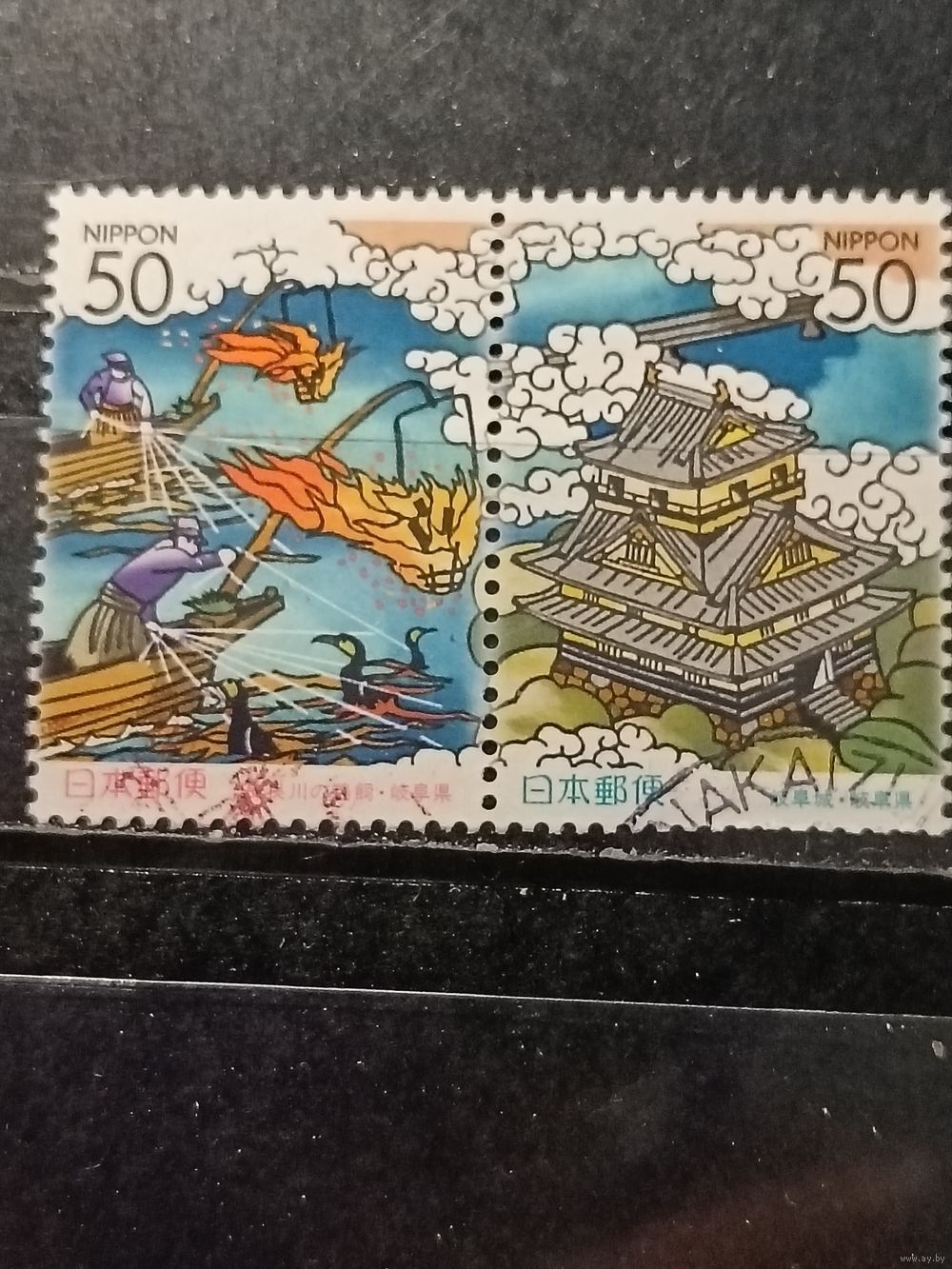 Япония, 2003. Традиционная рыбалка с бакланами и замок Гифу. сцепка. Mi-2,4 евро гаш.