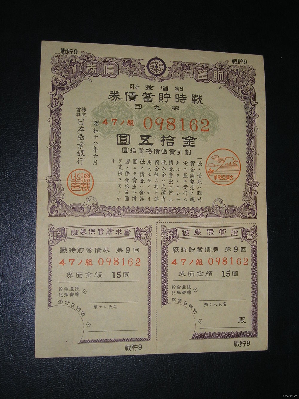 Япония, Военная облигация 15 Иен 1943