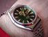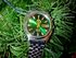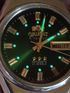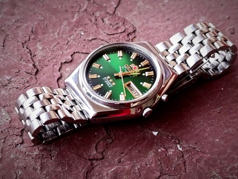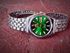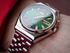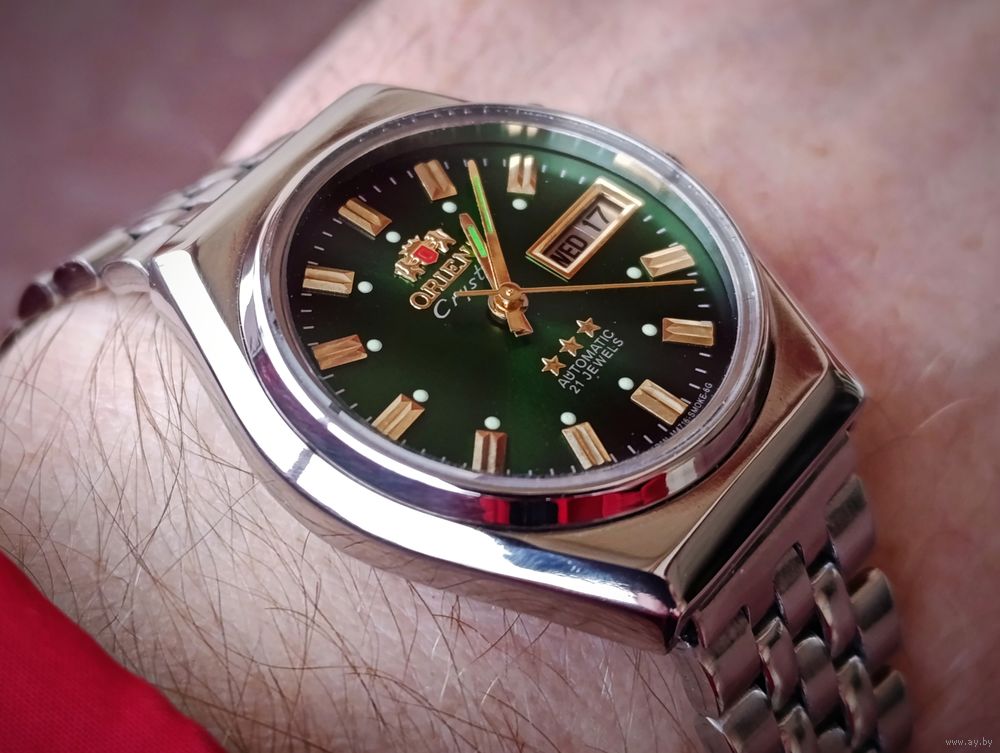 Циферблат зеленого цвета с золотистыми делениями и двойным календарем.