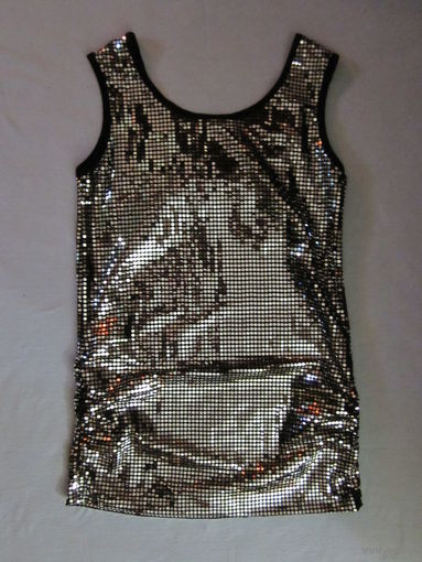 На объем груди не больше А. Длина от плеча 57 см, ПОГ 33. На груди бант с крупным стразом, по бокам внизу сборочки.Пр-во Турция (фабричный).