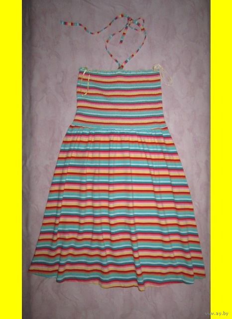 Маркировка - см. фото! Длина 78 см. Бретельки завязываются за шеей. Ширина по груди в состоянии покоя 32 см, тянется прилично, оптимально до 45 см.
