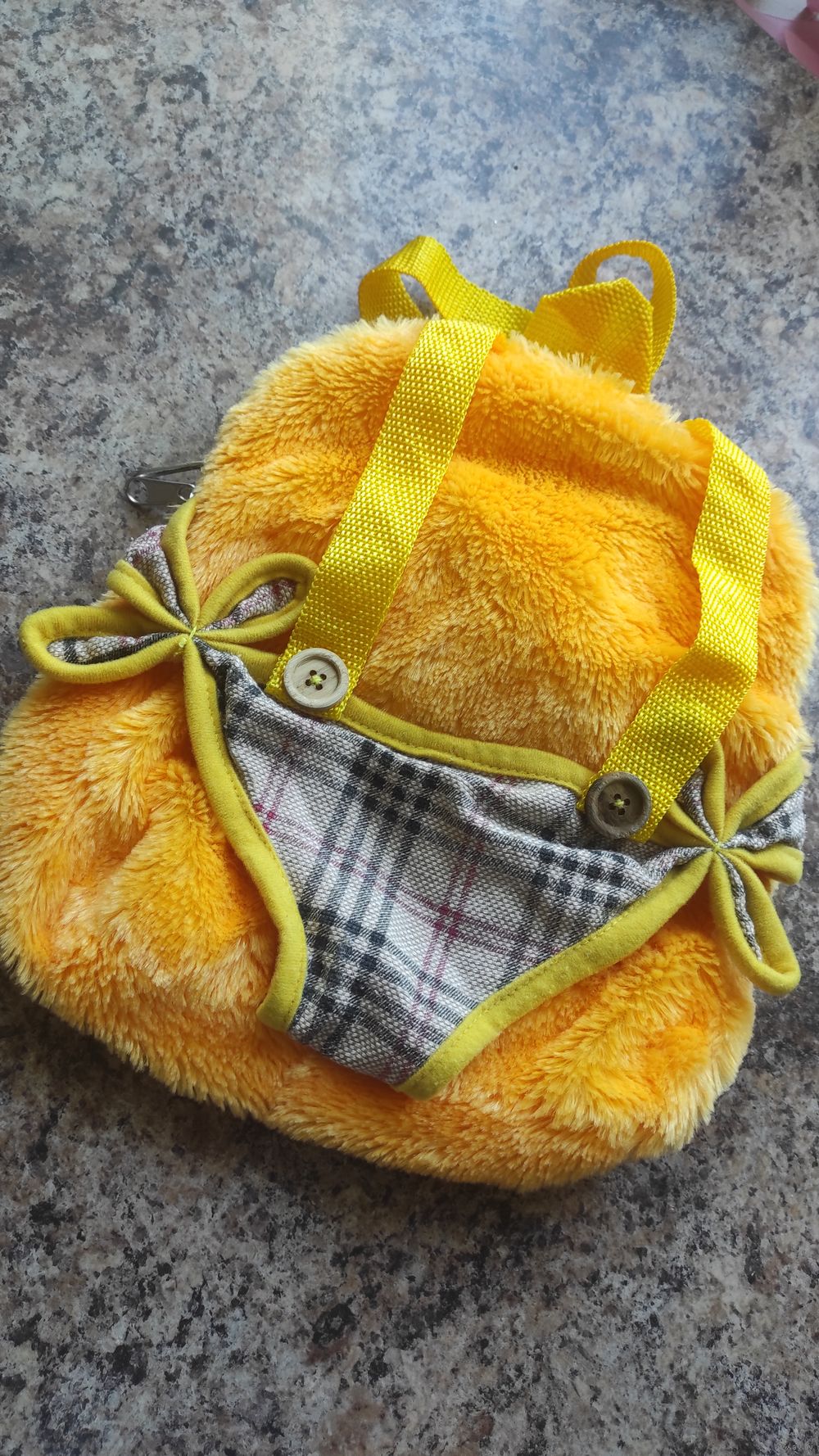 Яркий рюкзачок, можно посадить мягкую игрушку. Размер 27 на 24 см.
