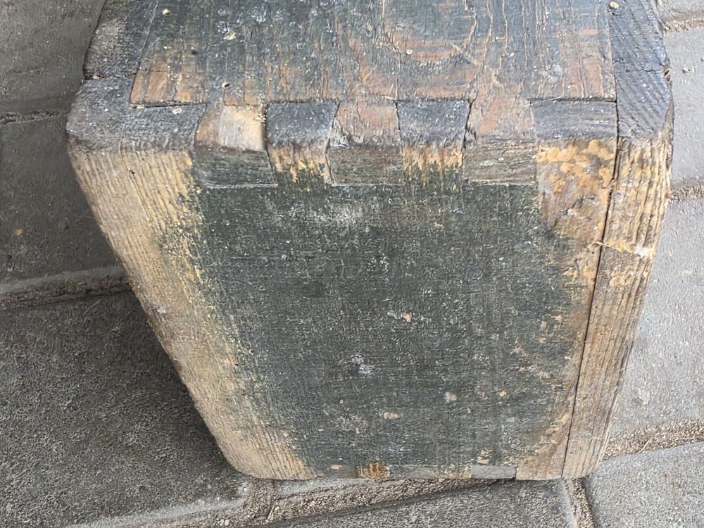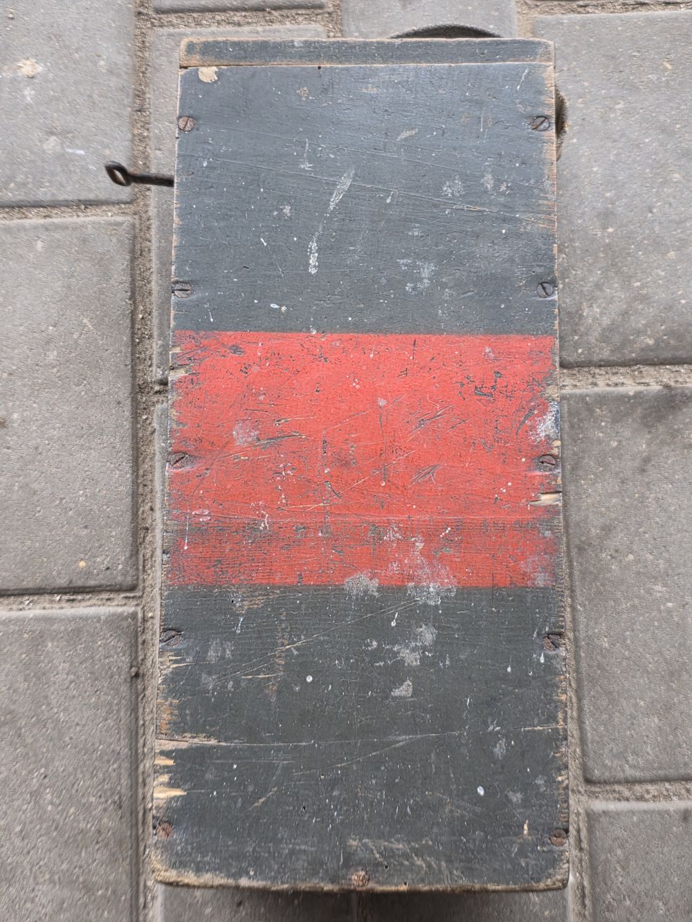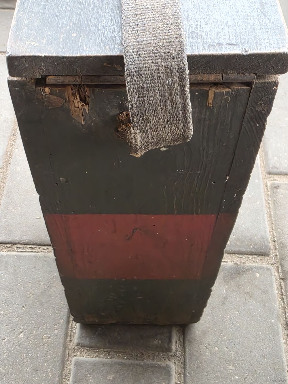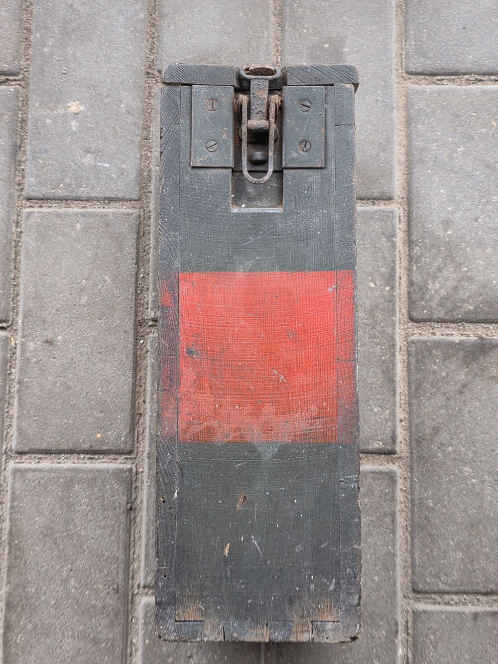 34×12×16 см. Защёлка рабочая, на крышке, внутри, есть клеймо с курицей, под ней WEL 170(внизу справа). Крепкое дерево, нет саморезов с одной стороны завеса.