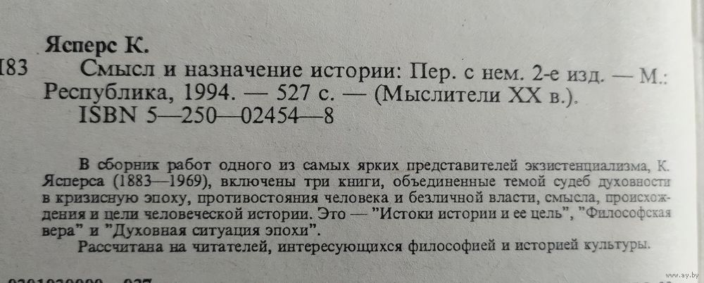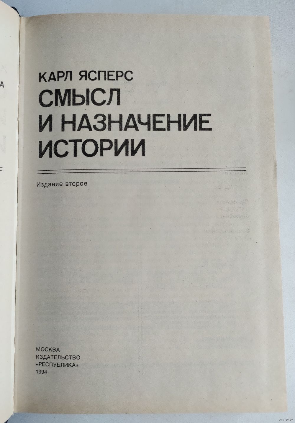 Ясперс Карл. Смысл и назначение истории. Серия: "Мыслители XX века". Перевод с немецкого М. И. Левиной. Вступительная статья П. П. Гайденко. Составление М. И. Левиной, П. П. Гайденко. Комментарии В. Н. Катасонова. Редактор М. М. Беляев. 2-е издание. Москва: Республика. 1994г. 527 с. Без суперобложки. Твёрдый переплёт. Обычный формат.