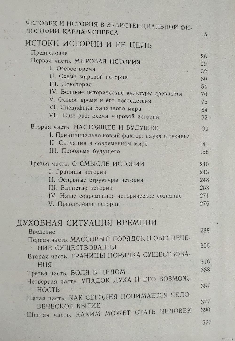 СОДЕРЖАНИЕ: Человек и история в экзистенциальной философии Карла Ясперса. Истоки истории и её цель. Предисловие. Мировая история: Осевое время. Схема мировой истории. Доистория. Великие исторические культуры древности. Осевое время и его последствия. Специфика Земного мира. Ещё раз: схема мировой истории. Настоящее и будущее: Принципиально новый фактор: наука и техника. Ситуация в современном мире. Проблема будущего. О смысле истории: Границы истории. Основные структуры истории. Единство истории. Наше современное историческое сознание. Преодоление истории. Духовная ситуация времени: Введение. Массовый порядок и обеспечение существования. Границы порядка существования. Воля в целом. Упадок духа и его возможность. Как сегодня понимается человеческое бытие. Каким может стать человек. Философская вера.: Понятие философской веры. Содержание философской веры. Человек. Философия и религия. Философия и нефилософия. Философия в будущем. Комментарии. Указатель имён.