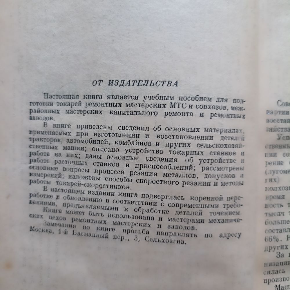 Настоящая книга является учебным пособием для подготовки токарей ремонтных мастерских МТС и совхозов, межрайонных мастерских капитального ремонта и ремонтных заводов. В книге проиведены сведения об основных материалах, применяемых при изготовлении и востановлении деталей тракторов, автомобилей, комбайнов и других сельскохохозяйственных машин, описано устройство токарных станков и работа на них, даны основные сведения об устройстве и работе расточных станков и приспособлений, рассмотренные основные вопросы процесса резания металлов, допусков и измерений, изложены способы скоростного резания и методы работы токарей-скоростников.
