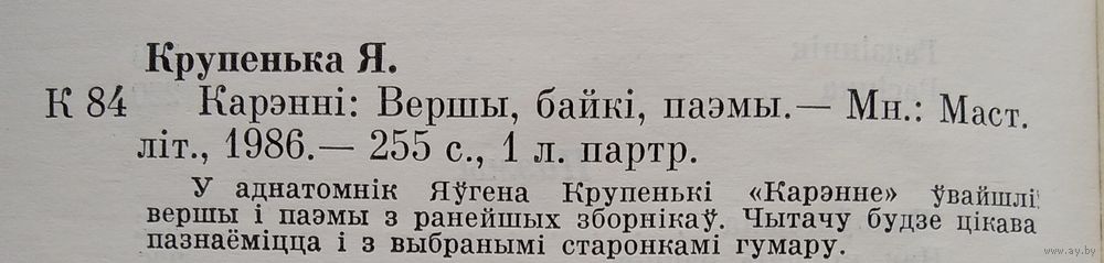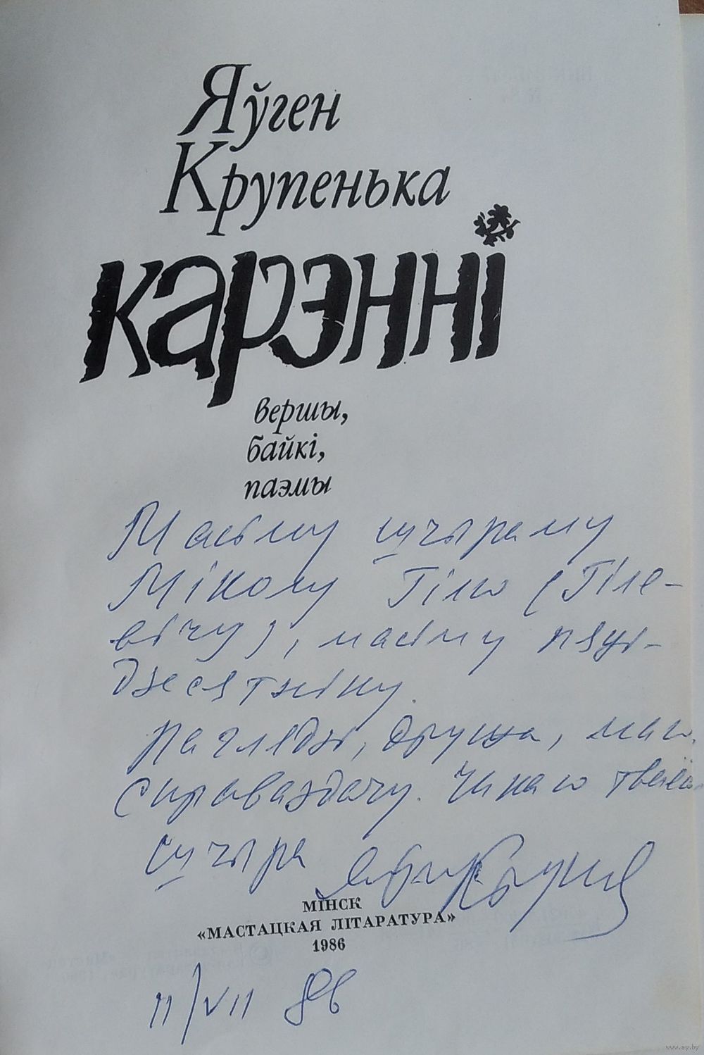 Яўген Крупенька. Карэнні: вершы, байкі, паэмы. Аўтограф аўтара. Мінск. Мастацкая літаратура, 1986 г. 253 с. Цверды пераплет.