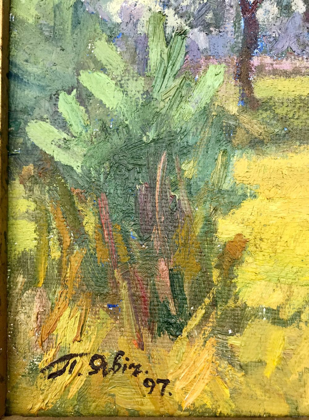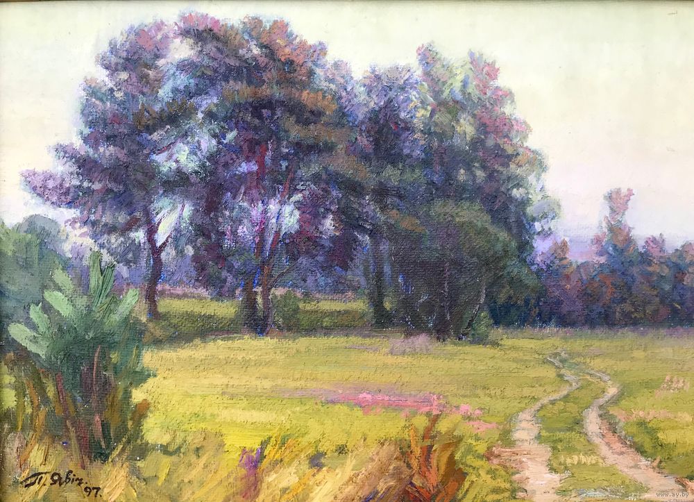Явич Петр Максович (1918-2008). Пленер озеро Янова . "Поляна", 1997 год. Холст, масло. Размер 50×30 см. Пленэ́р (от фр. en plein air — «на открытом воздухе») — термин, обозначающий передачу в картине всего богатства изменений цвета, обусловленных воздействием солнечного света и окружающей атмосферы.