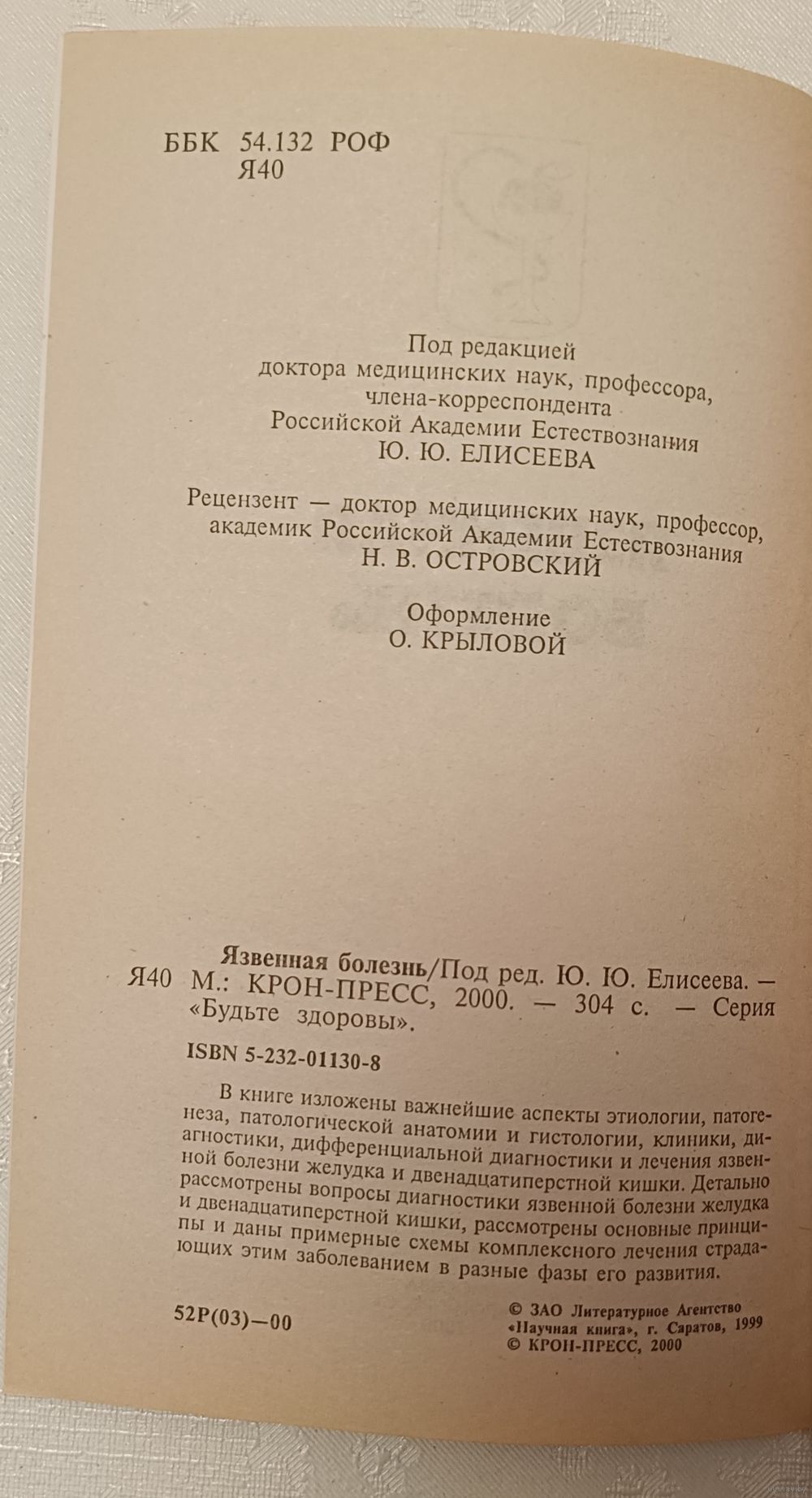 Язвенная болезнь/Под ред. Ю. Ю. Елисеева. М.: КРОН-ПРЕСС, 2000, стр. 304, Серия «Будьте здоровы», мягкая обложка, обычный формат.