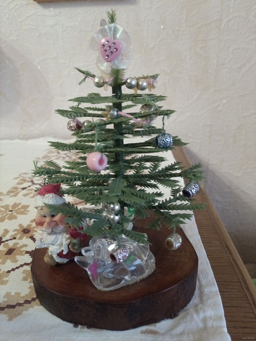 Елка времён СССР, высота ёлки с подставкой 15,5 см., наклеена на деревянный лакированный спилок, приклеен дед мороз с игрушками, украшена мини- грушками