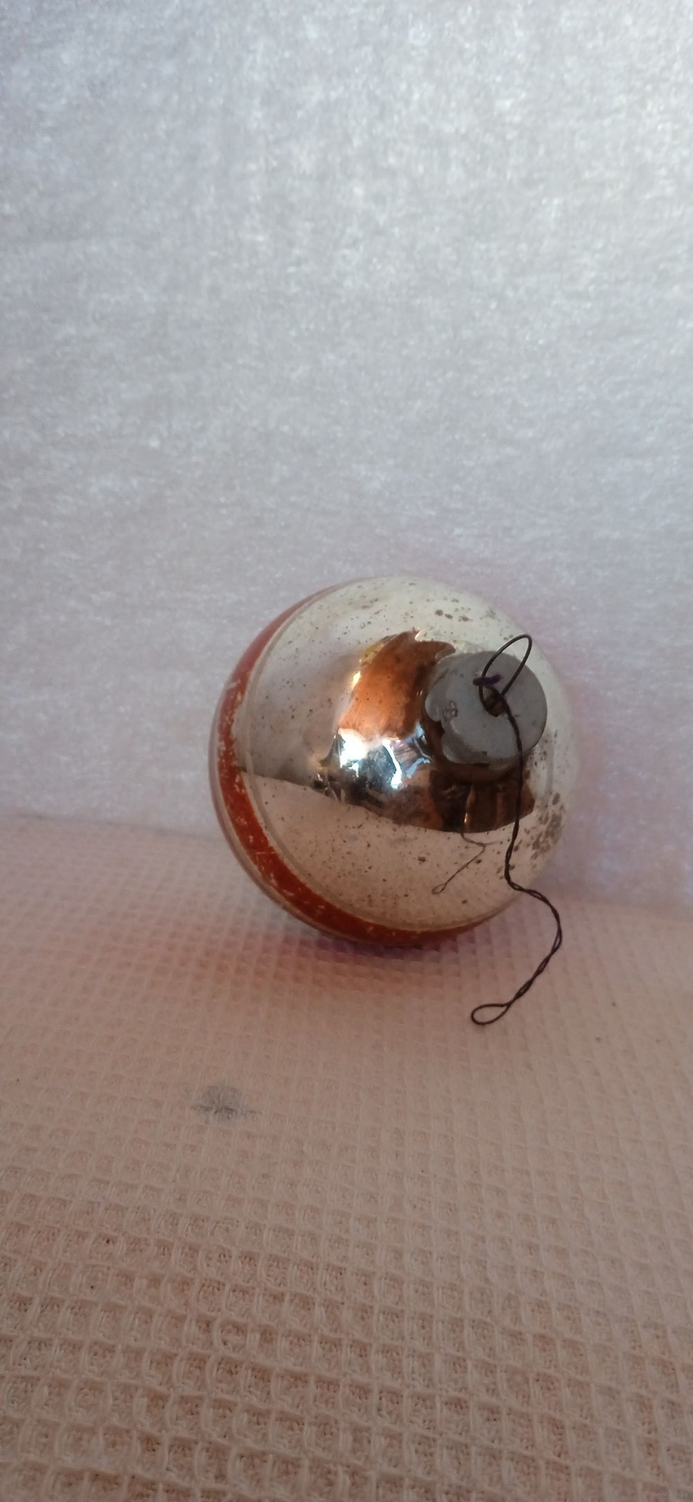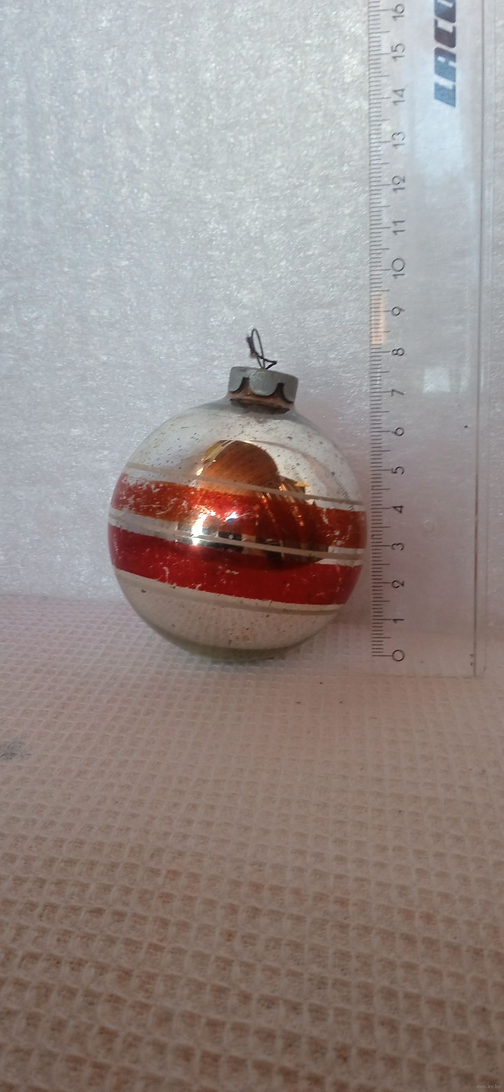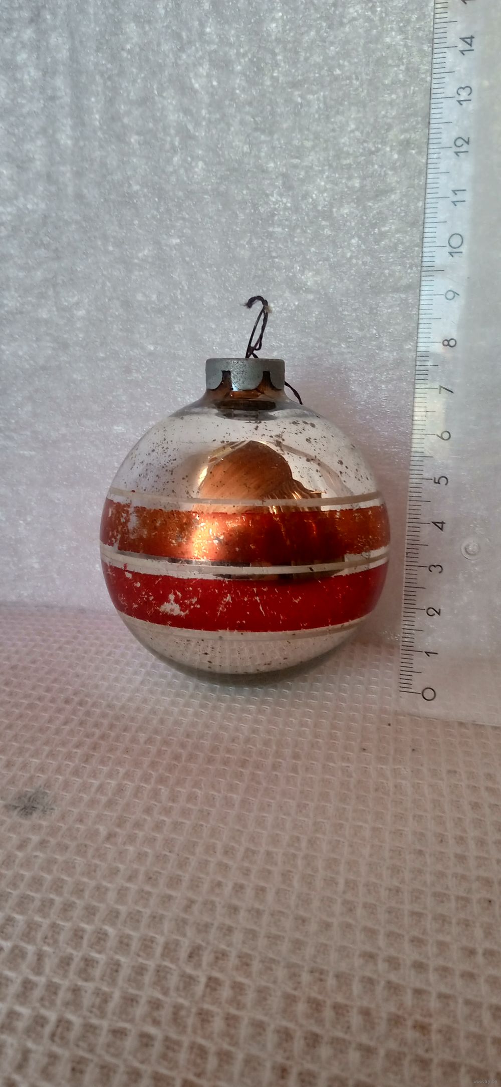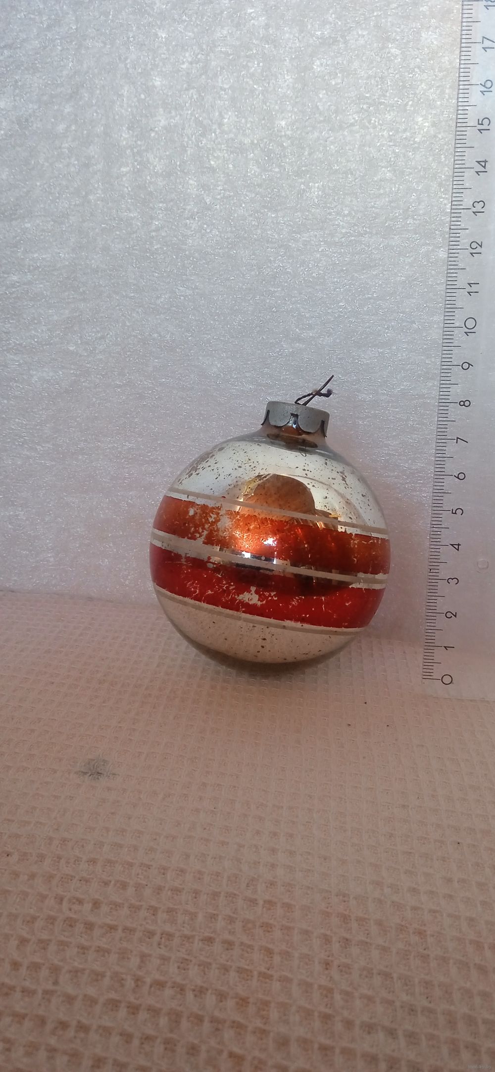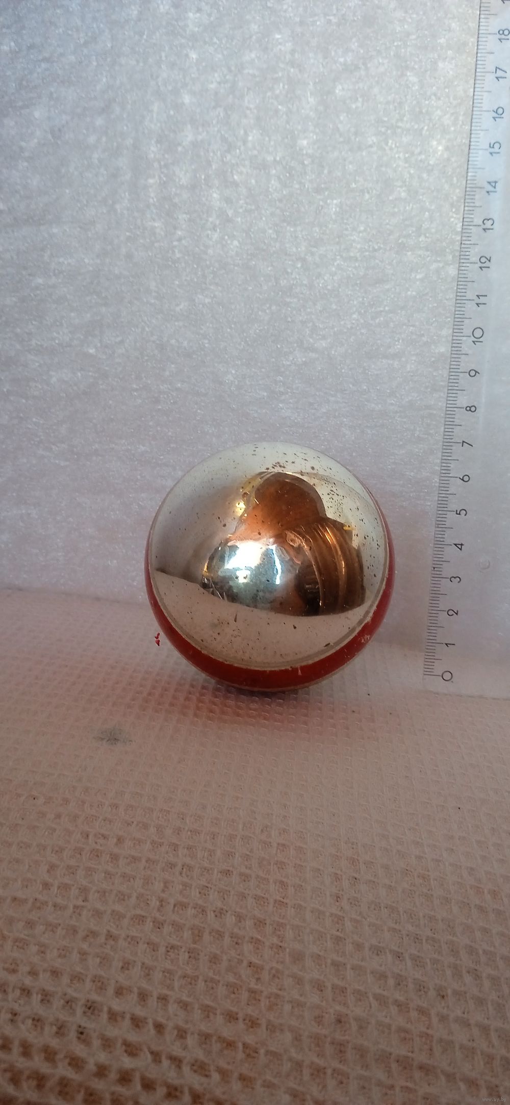 тяжеловатый, предположительно из толстого стекла, особенно на донышке-это видно на фото, насколько амальгама внутри шара выше внешней линии донышка игрушки