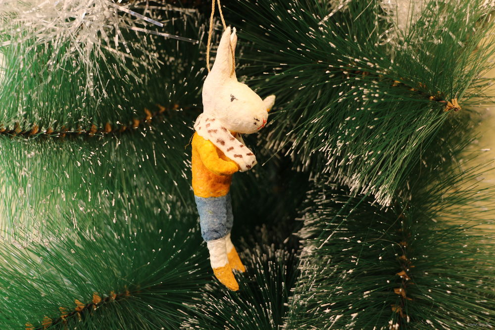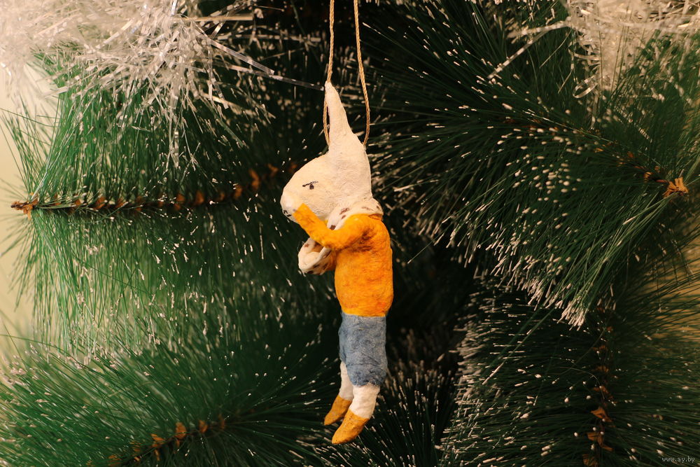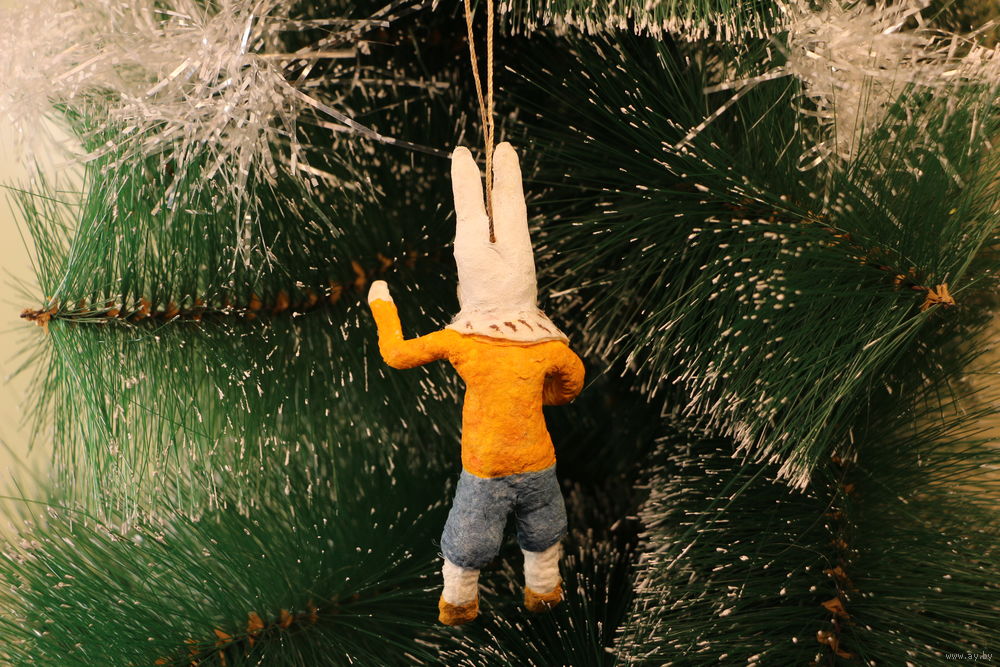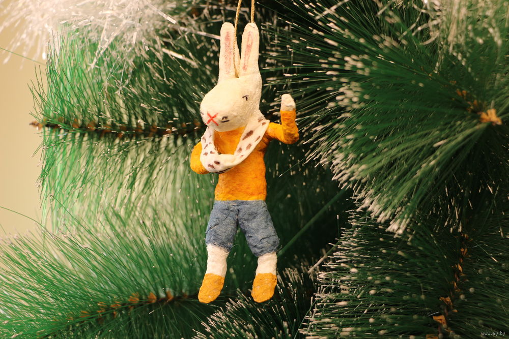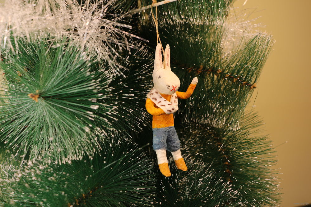 Ёлочная игрушка папье-маше, "Зайчик со сломанной рукой".