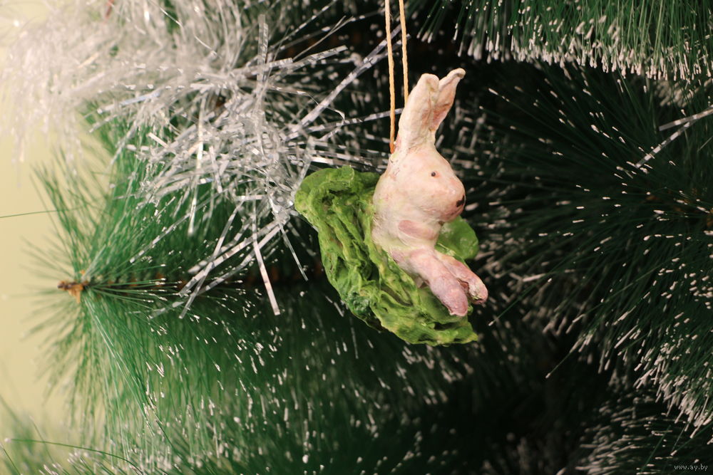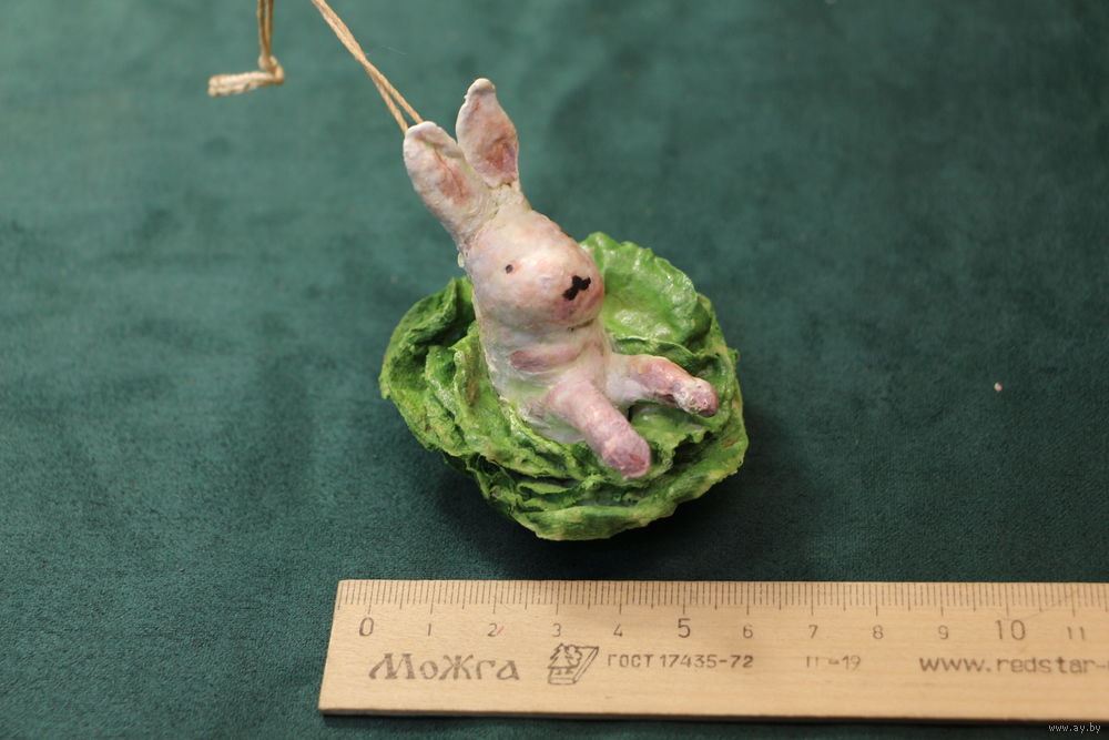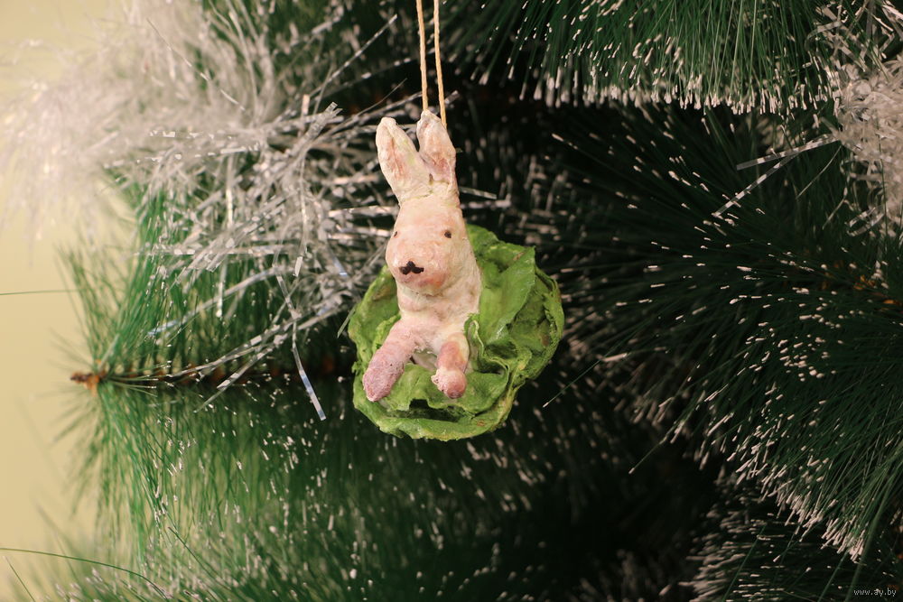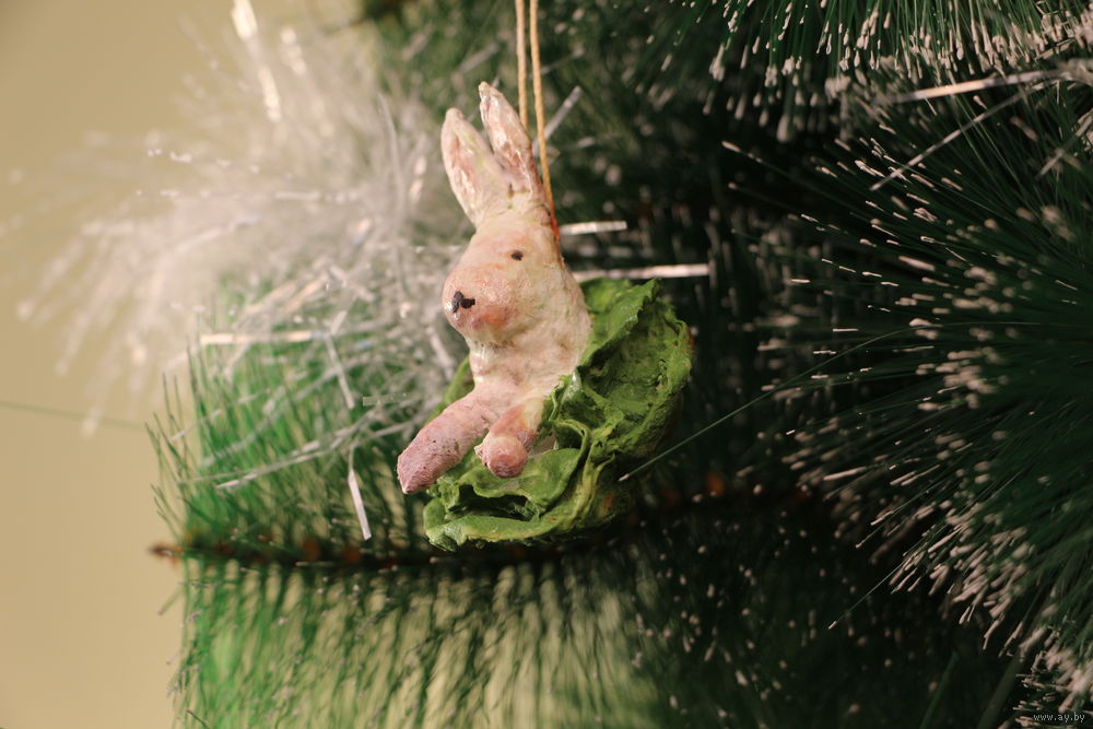 Ёлочная игрушка папье-маше, "Зайчик в капусте".