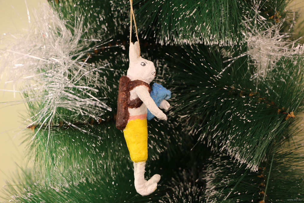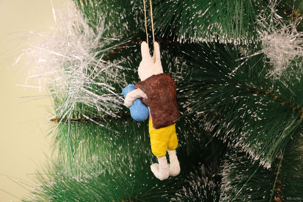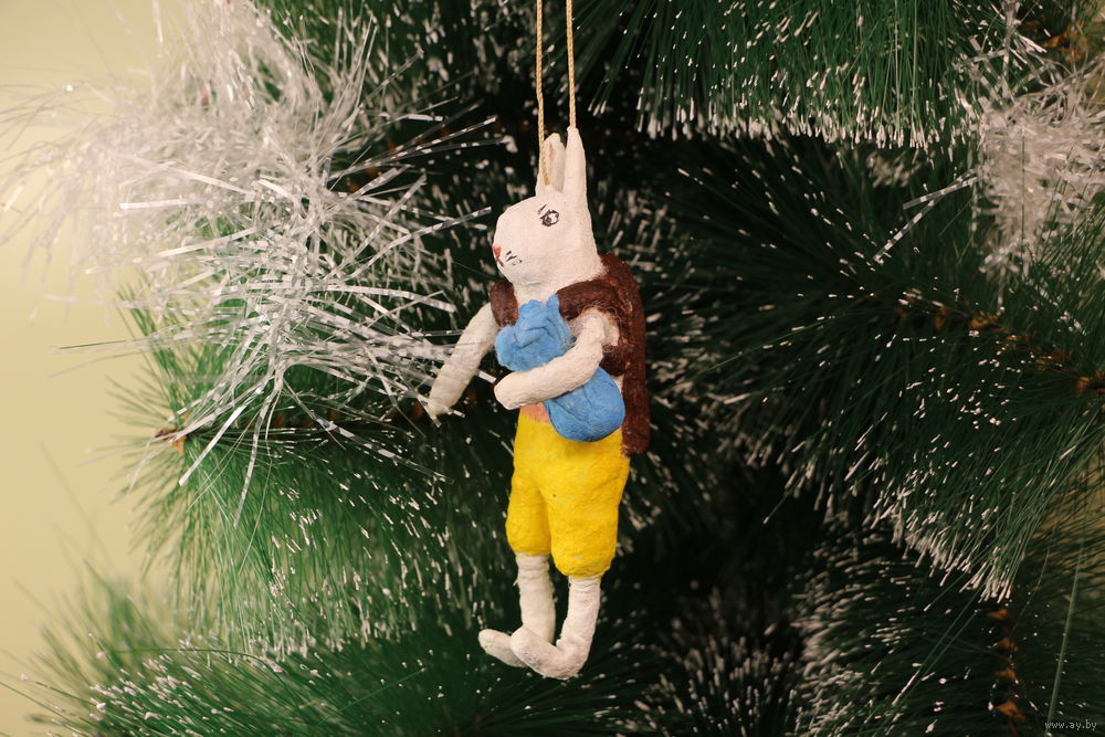 Ёлочная игрушка папье-маше, "Заяц с мешком".