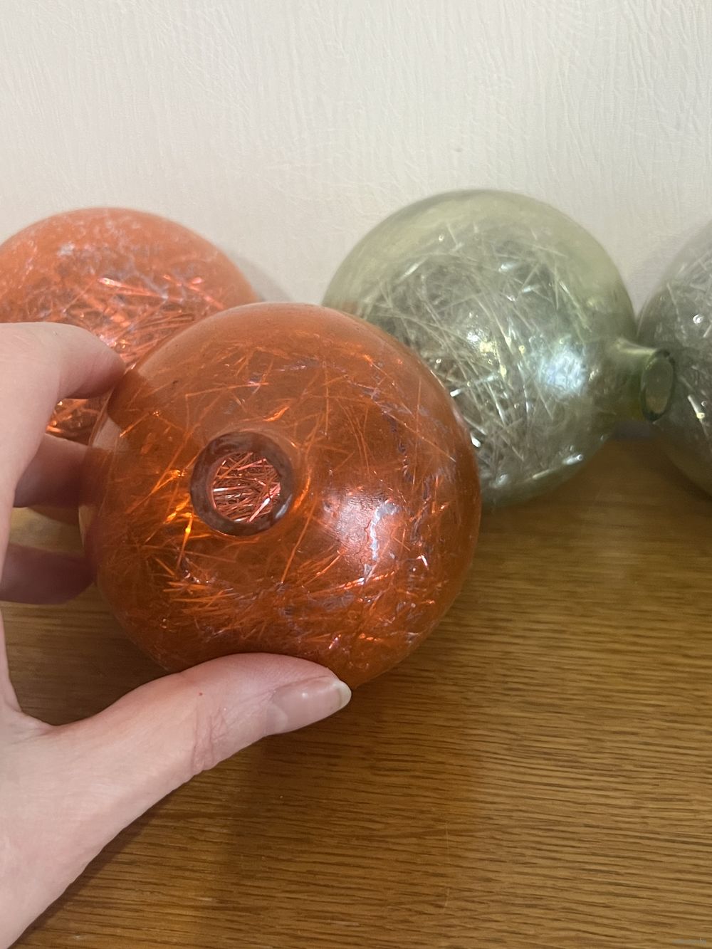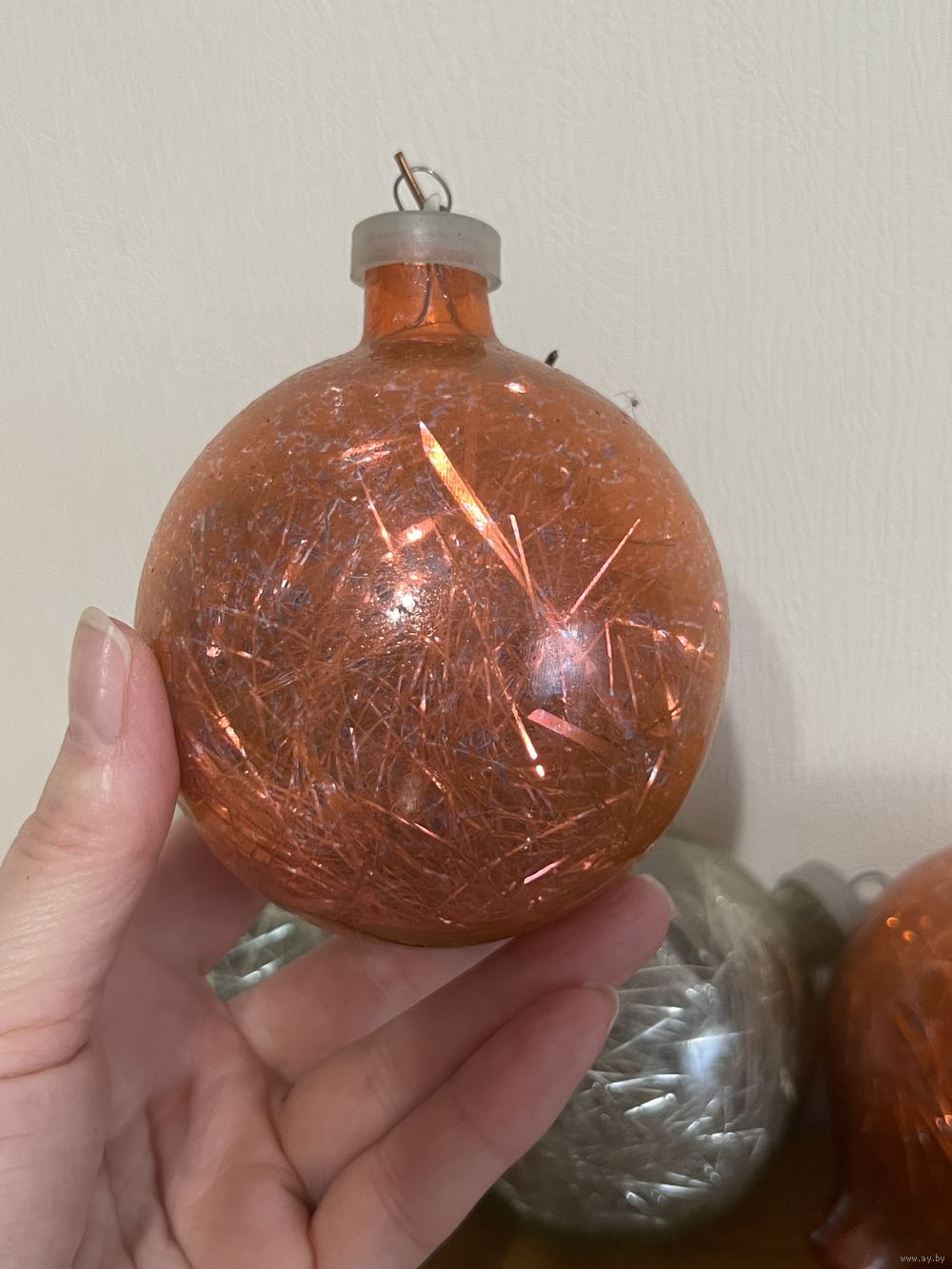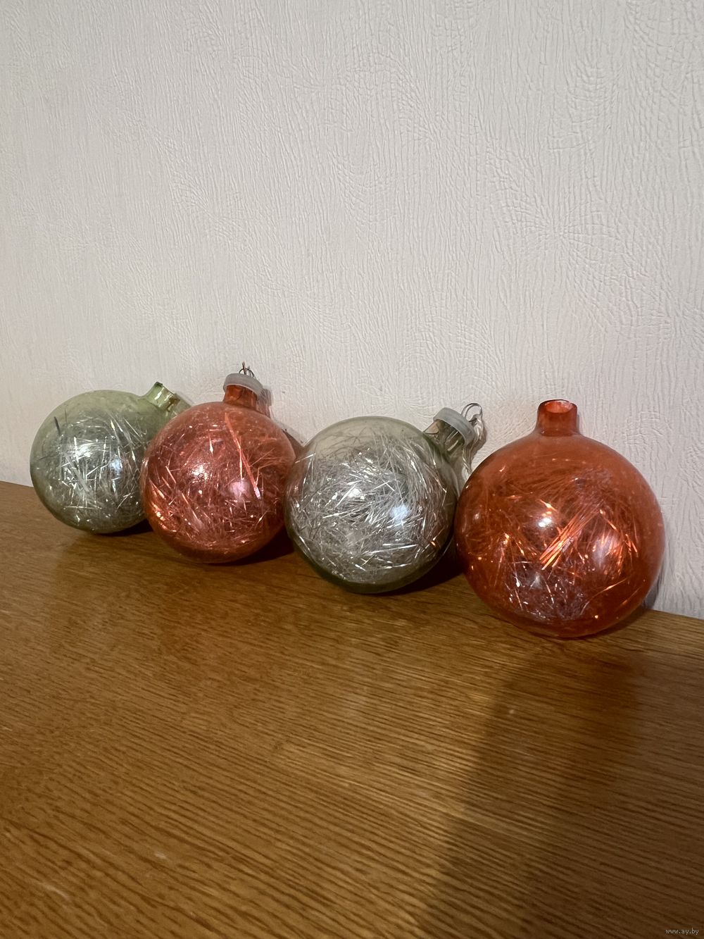 Редкие шары из толстого стекла . Внутри мишура . Редкие состояние хорошее , смотрите фото . В двух шарах нет подвесов.