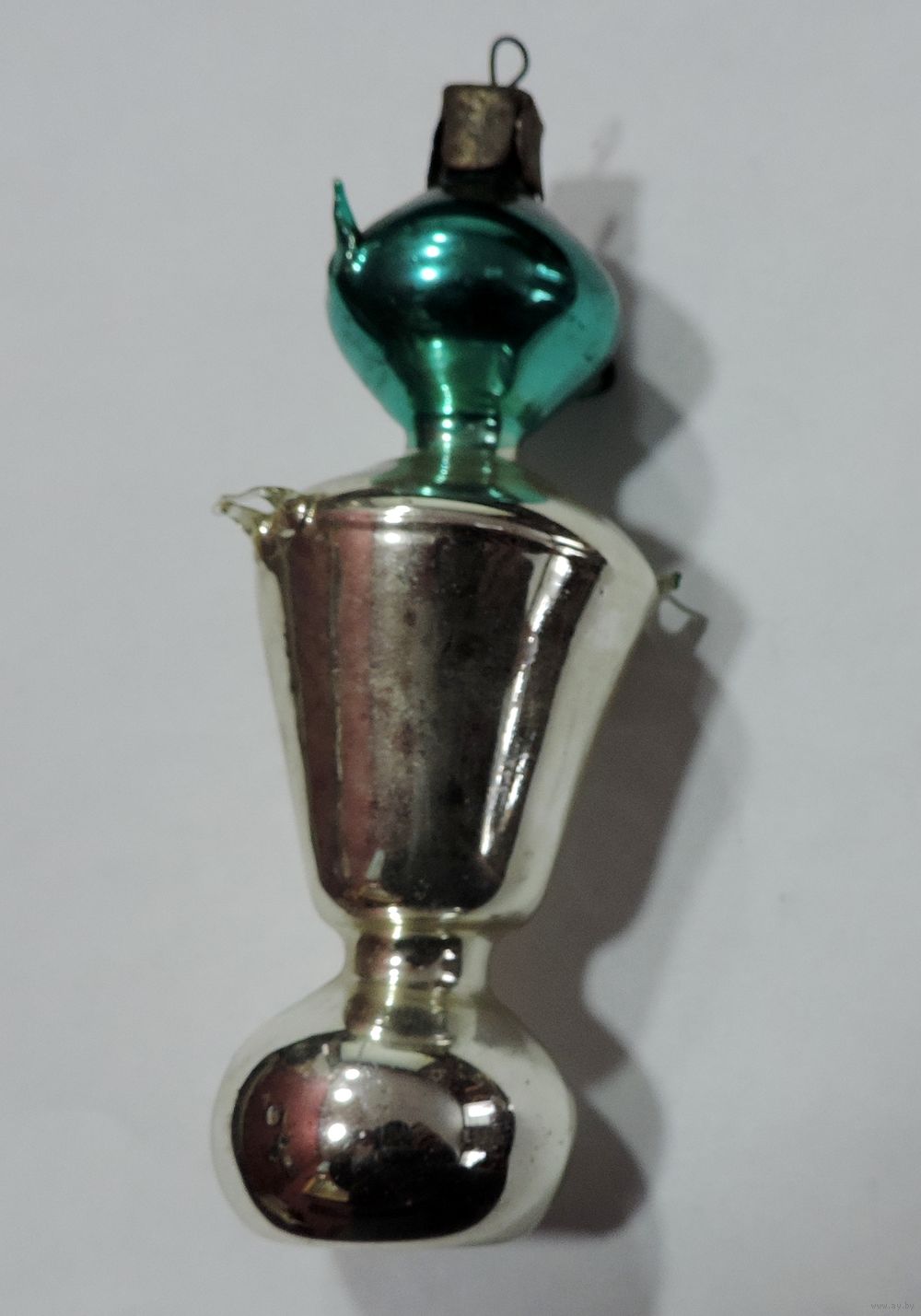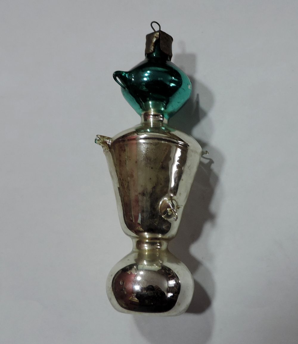 Ёлочная стеклянная игрушка "Самовар с чайником" 60-е годы СССР. Длина 11.5 см. Целая.