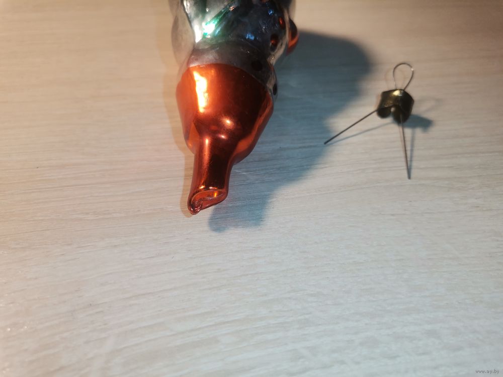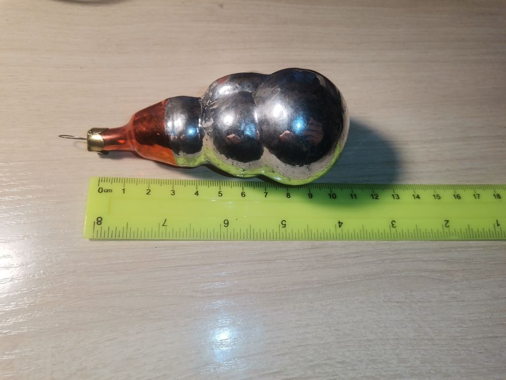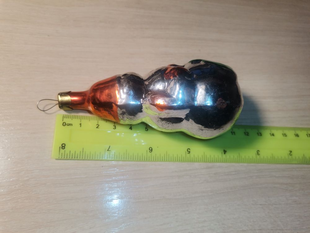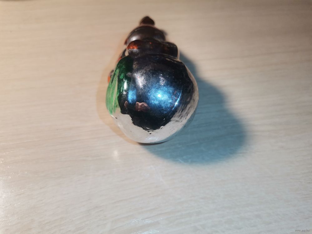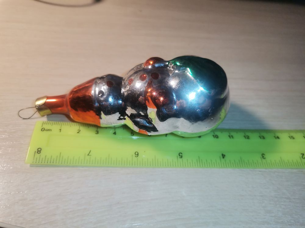 Ёлочная, стеклянная игрушка "Снеговик", времён СССР, без сколов, длина 11 см.