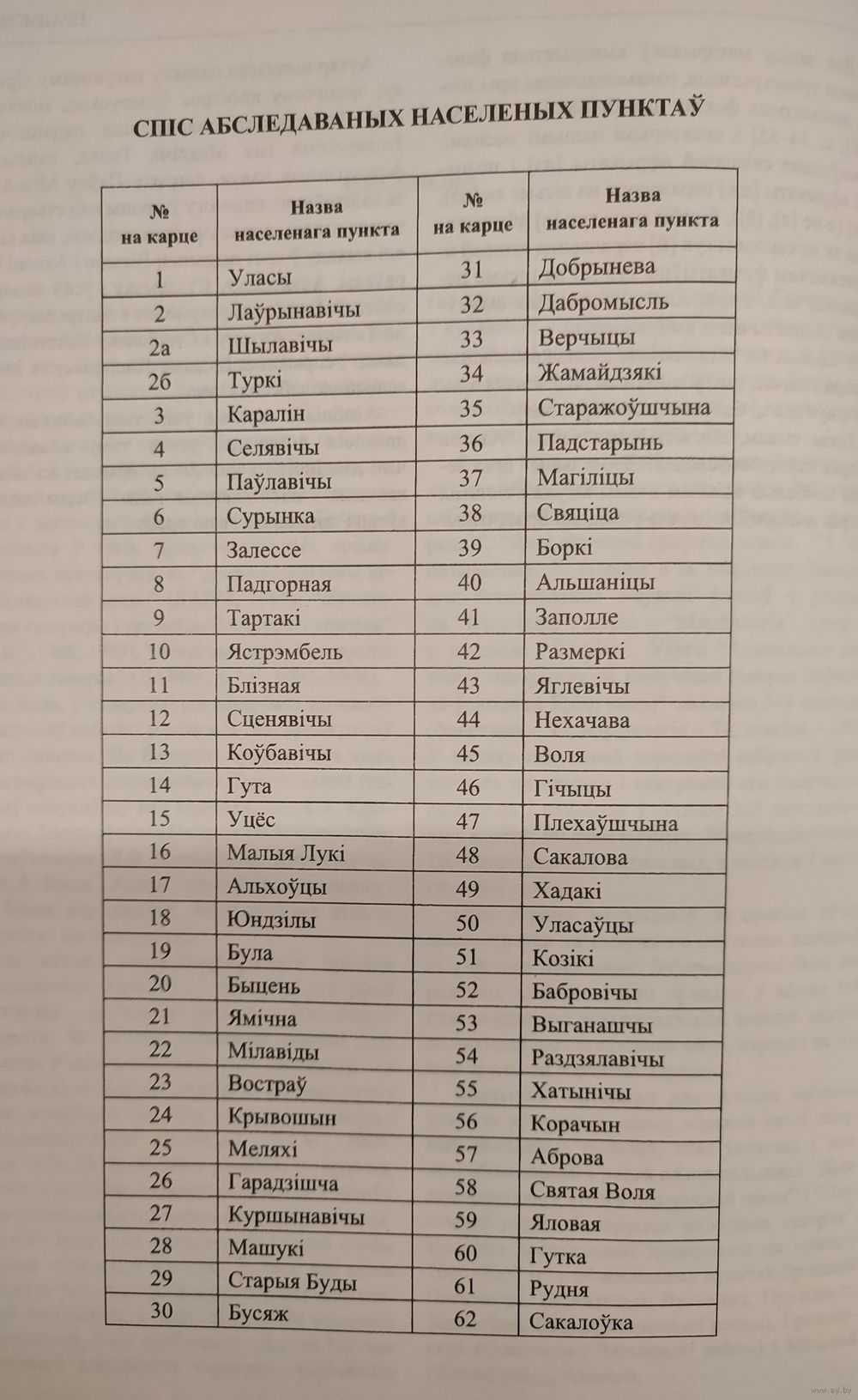 Палявыя даследаванні праведзеныя на працягу 2006–2007 гг. у 64 населеных пунктах Брэсцкай (Івацэвіцкі, Баранавіцкі, Ляхавіцкі, Пружанскі, Бярозаўскі, Пінскі, Ганцавіцкі раёны), Гродзенскай (Слонімскі і Зэльвенскі раёны) і Мінскай (Клецкі раён) абласцей.