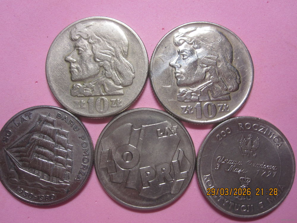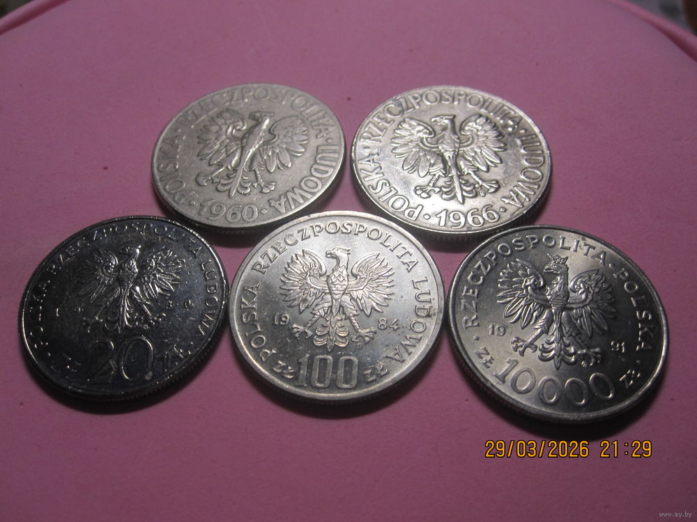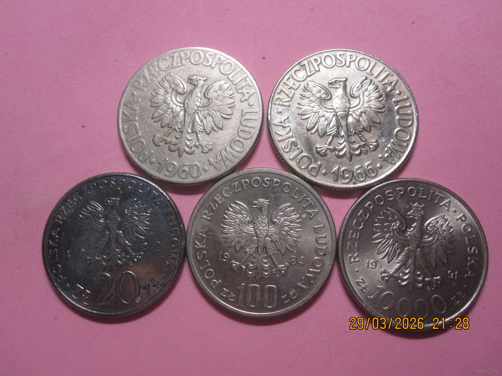 Юбилейные и редкие монеты Польши-10злотых 1960 и 1966г.20злотых 1980г. 100злотых 1984г. 10000злоттых 1991г.