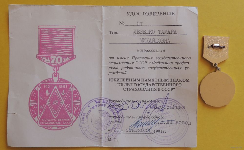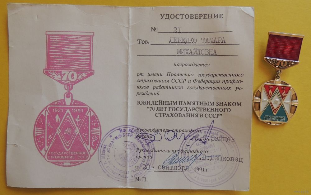 Юбилейный памятный знак "70 лет госстрахования СССР", 1991 г. (удостоверение+знак)
