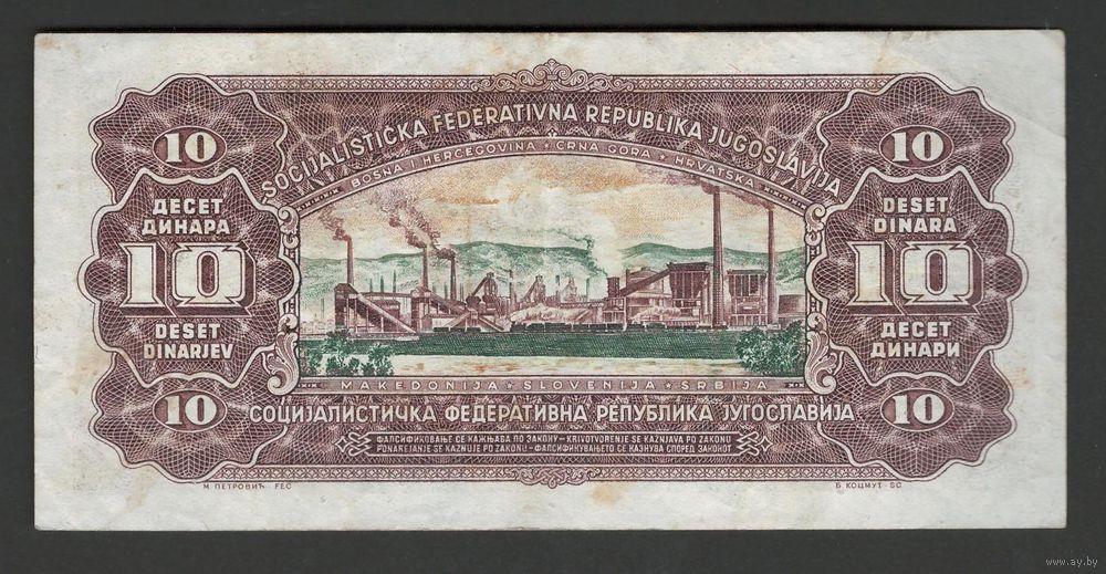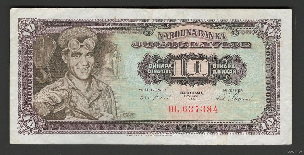Югославия 10 динар 1965 года. Тип P-78a. Маленький номер. Состояние XF