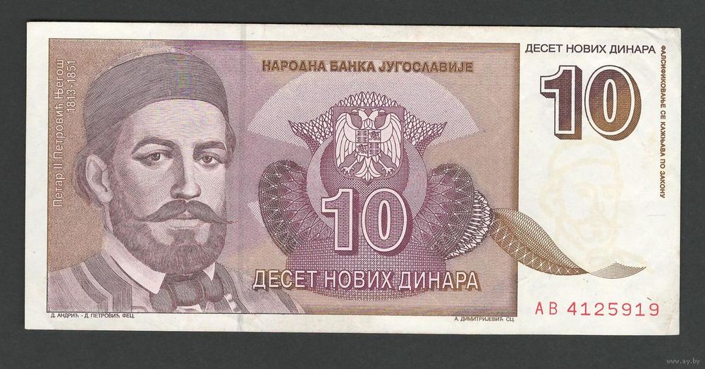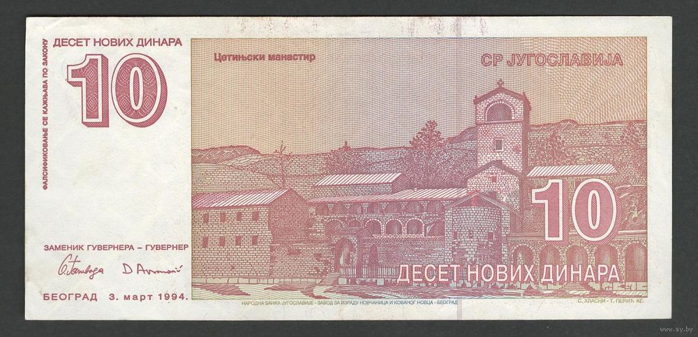 Югославия 10 динар 1994 года. Тип P-149. Состояние XF+