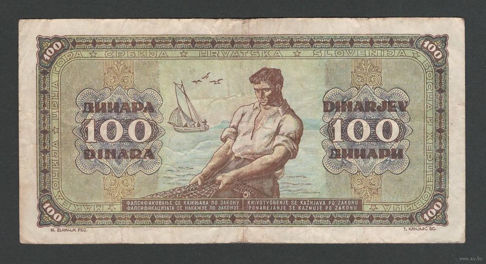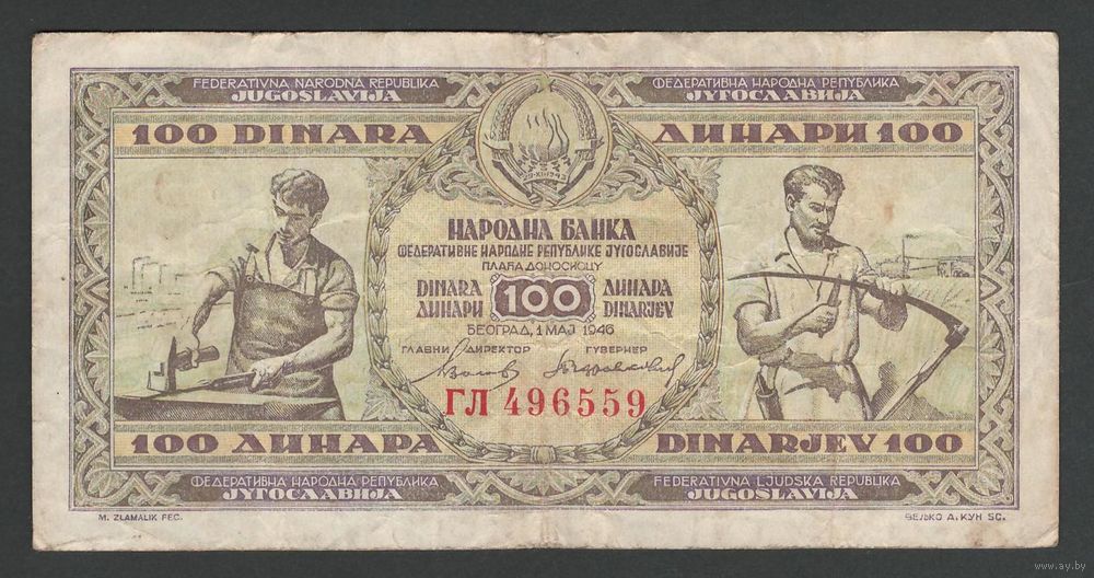 Югославия 100 динар 1946 года. Тип P-65с. Без защитной нити. Ошибка "JУГOCААBИJA". Состояние VF