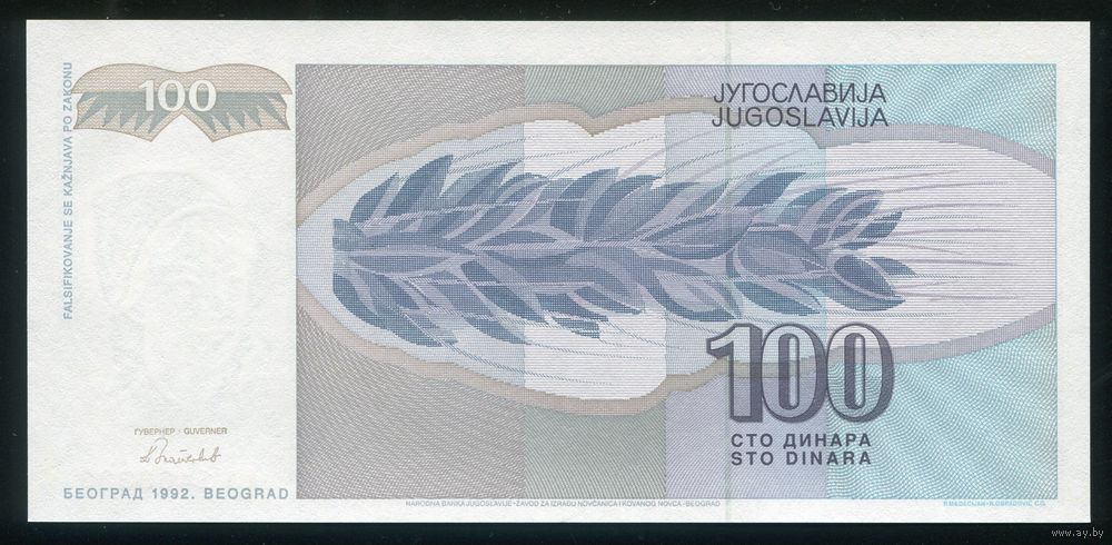 Югославия 100 динар 1992 г. P112. Серия AA. UNC