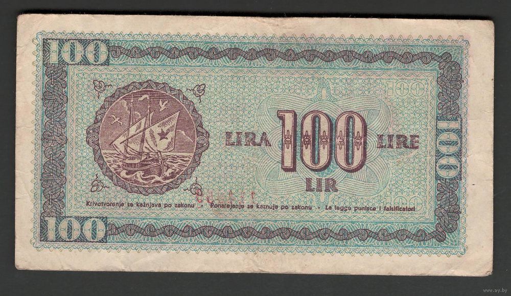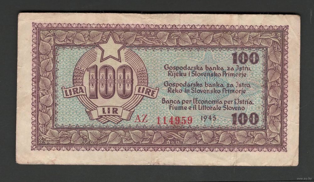 Югославия 100 лир 1945 года. С серийным номером. Тип Р-R6a. Состояние VF+