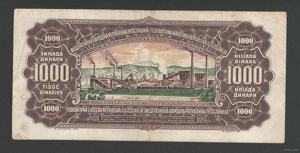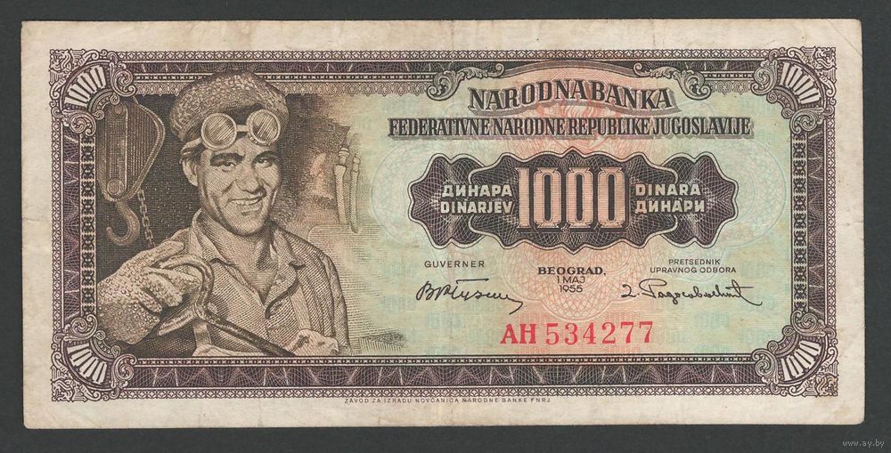 Югославия 1000 динар 1955 года. Тип P-71a. Без цифры 2. Состояние VF+